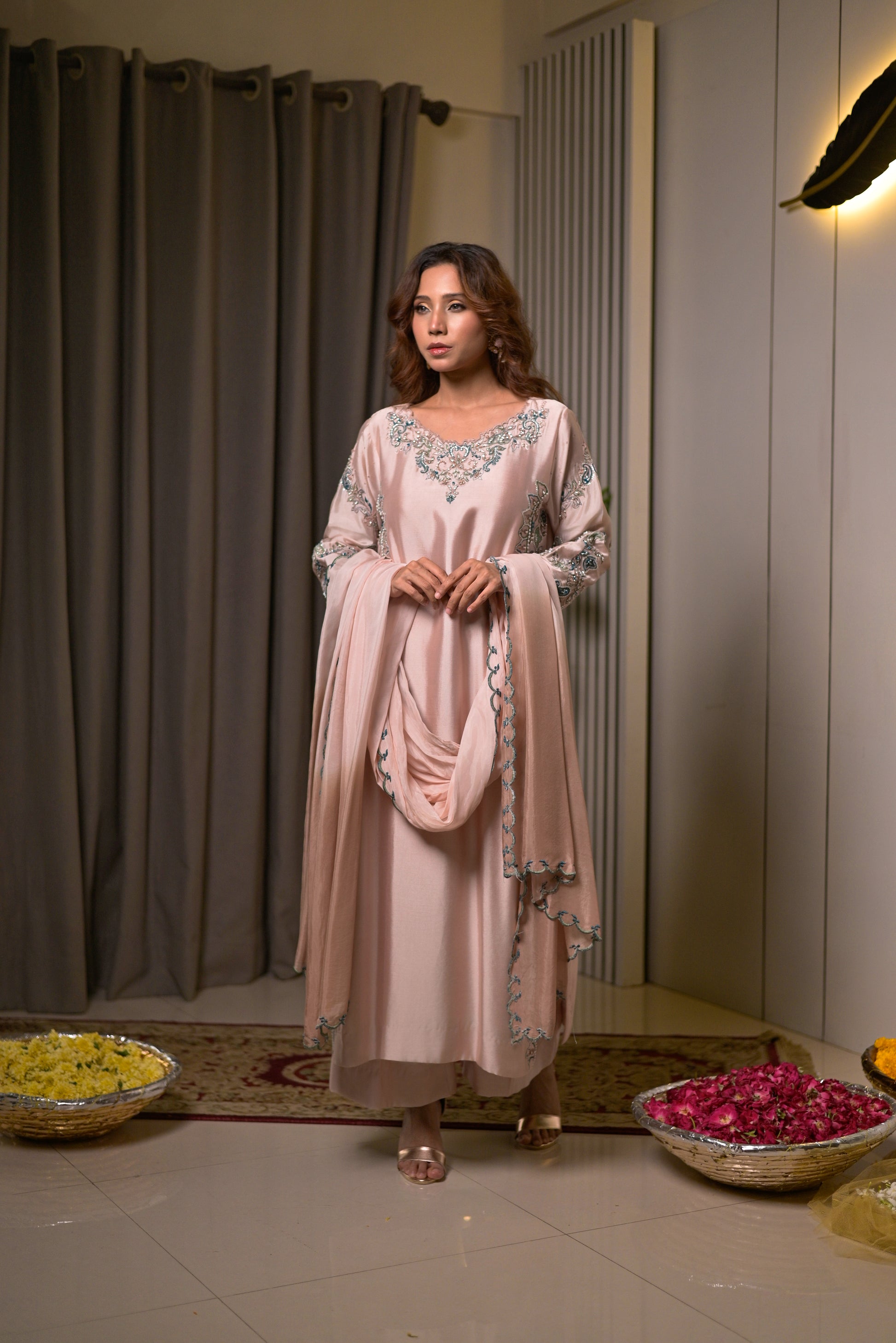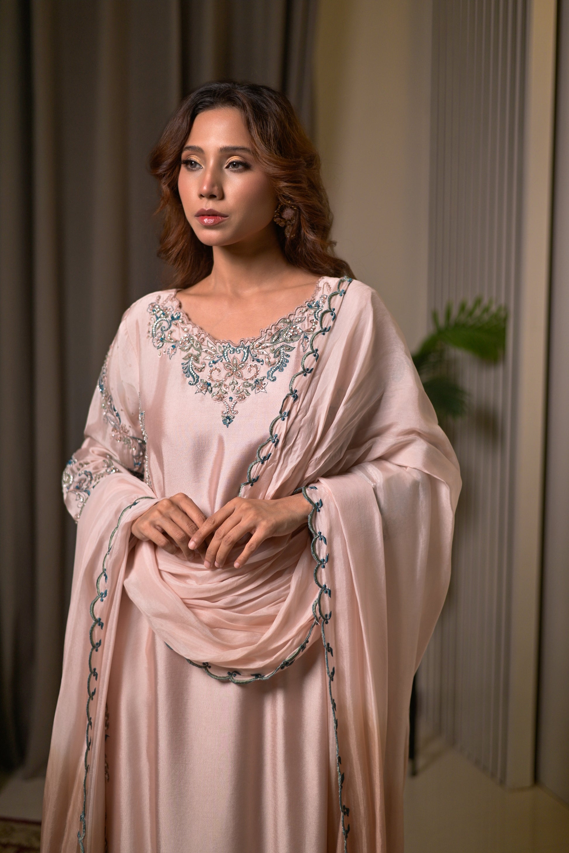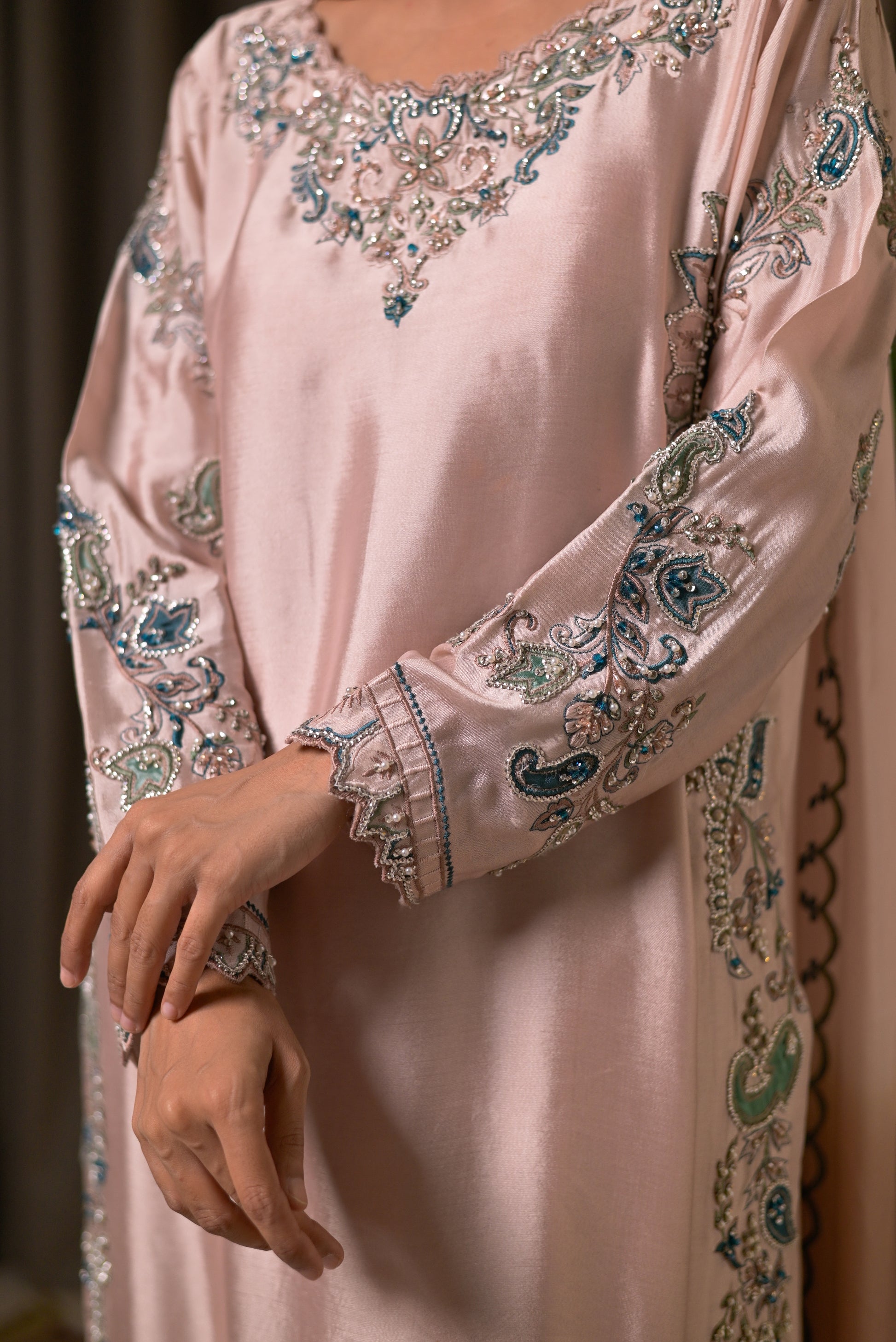 This graceful 3-piece suit is tailored from premium sheesha silk in a soft blush pink shade, radiating elegance and sophistication. The long flowing shirt is adorned with intricate handwork embroidery in pastel tones across the neckline, sleeves, and borders, adding a delicate yet luxurious charm. The look is completed with matching straight pants and a coordinating dupatta, finely detailed with embroidered edging for a refined finish. Feminine, timeless, and effortlessly chic, this ensemble is perfect for festive occasions, weddings, and formal gatherings where subtle glamour speaks volumes.