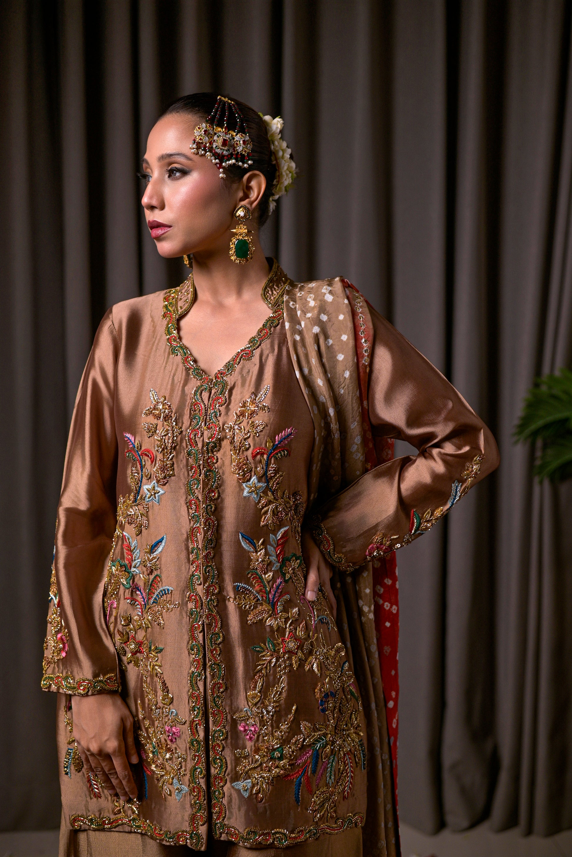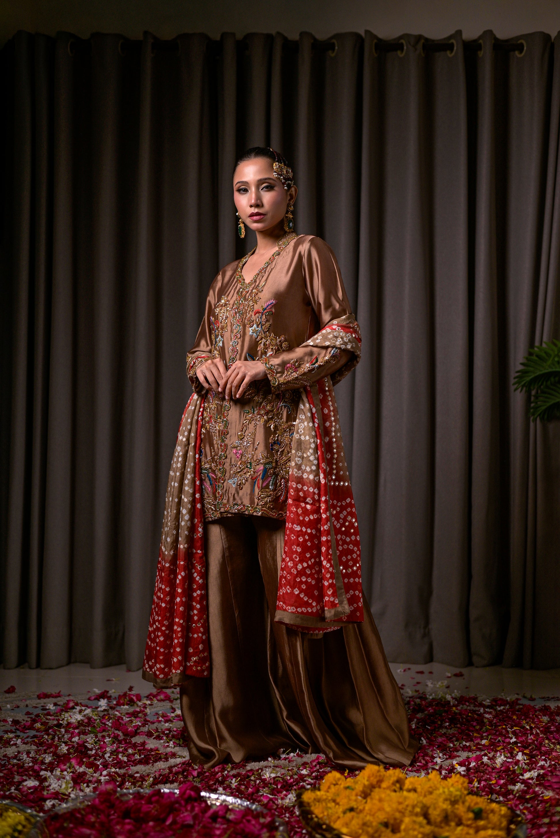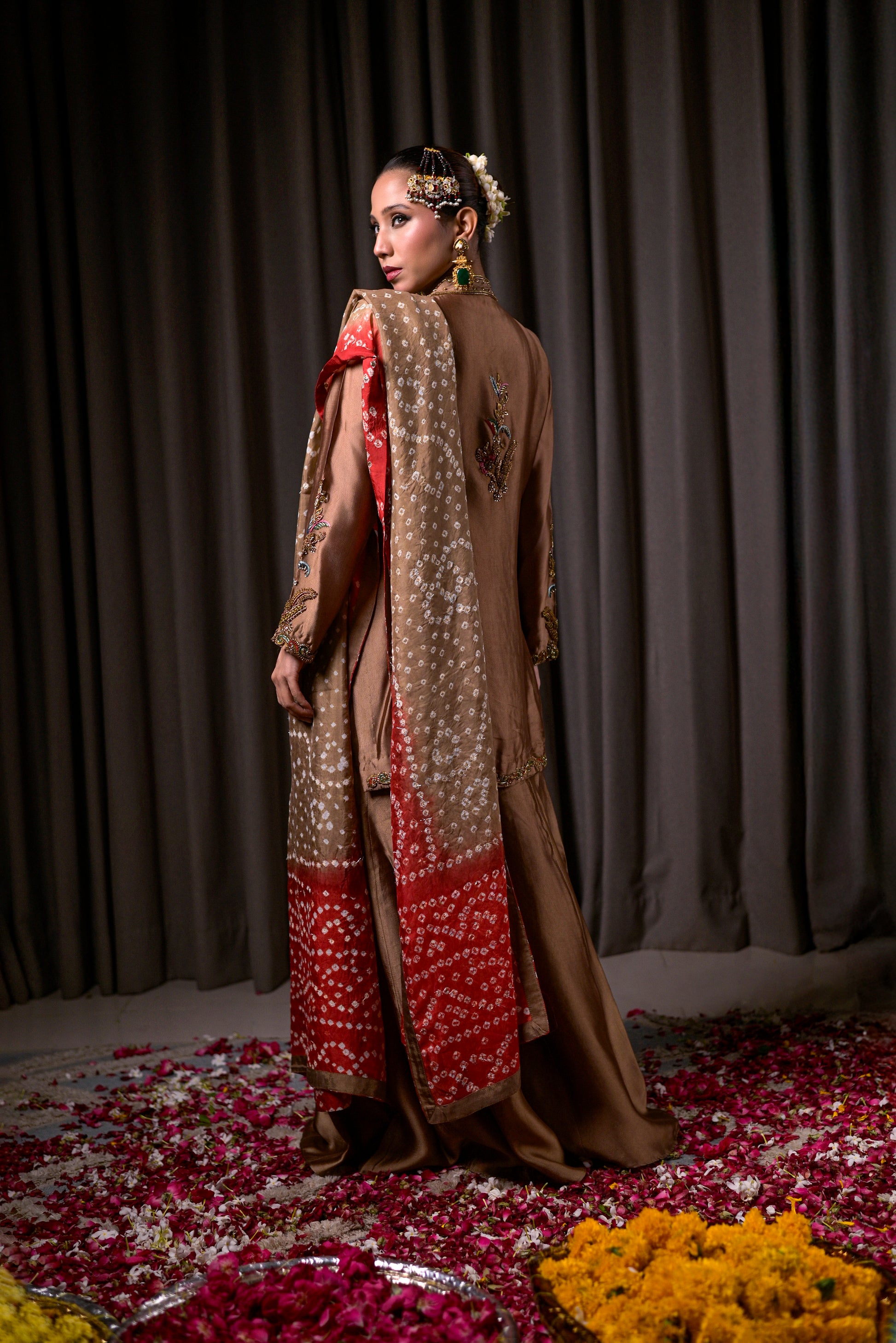 This stunning ensemble features a chocolate brown shisha silk shirt intricately hand-embroidered with multi-hued resham and tilla work, paired with a matching shisha silk gharara that flows effortlessly with regal grace. The look is completed with a traditional bandhani dupatta in striking tones of red and beige, adding a classic festive charm to the outfit. A perfect blend of elegance and cultural heritage — ideal for intimate weddings or festive soirées.