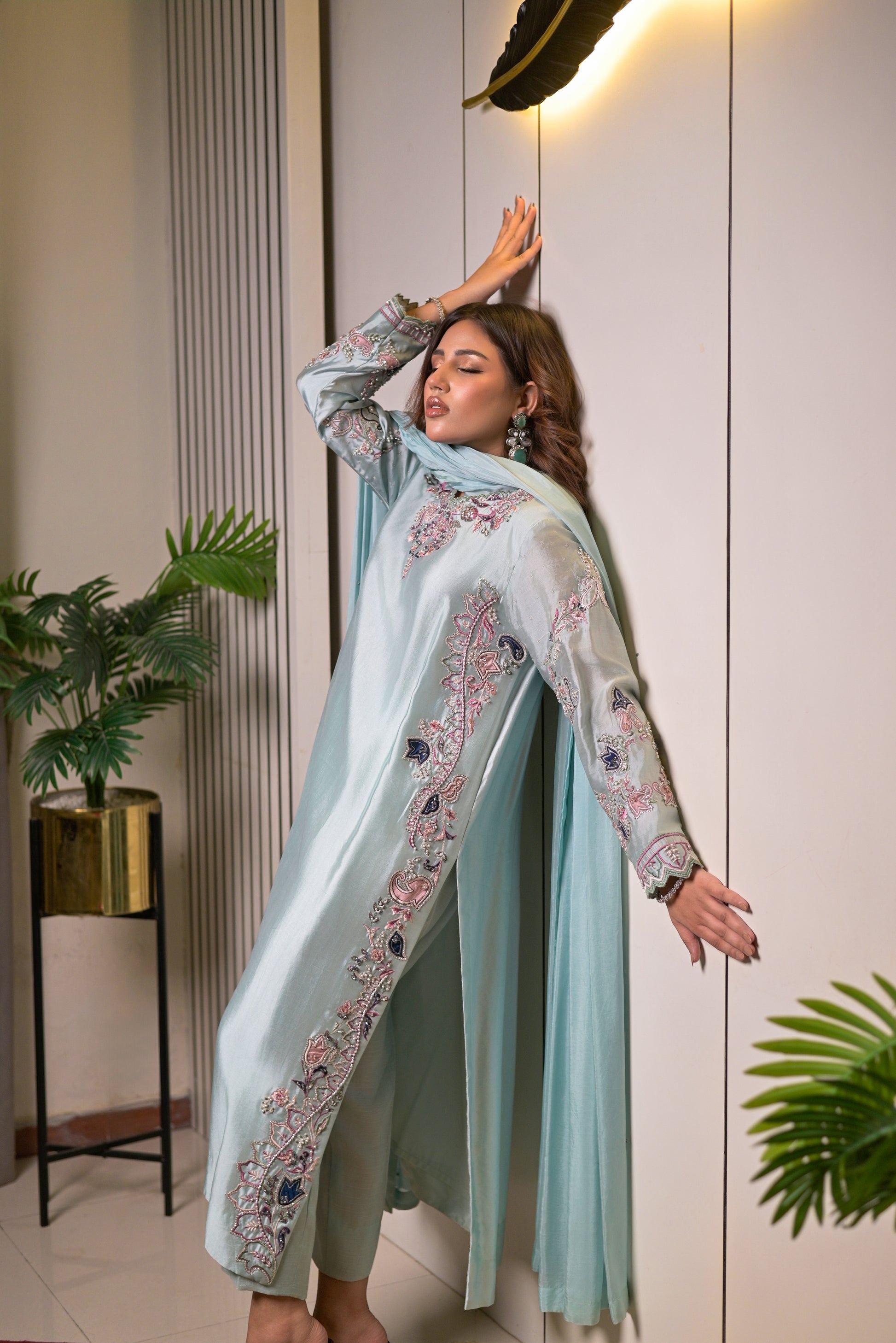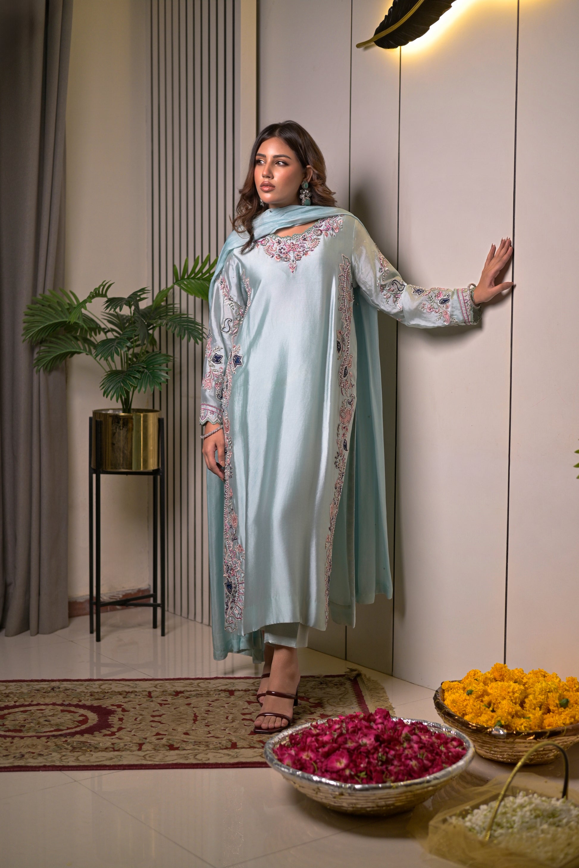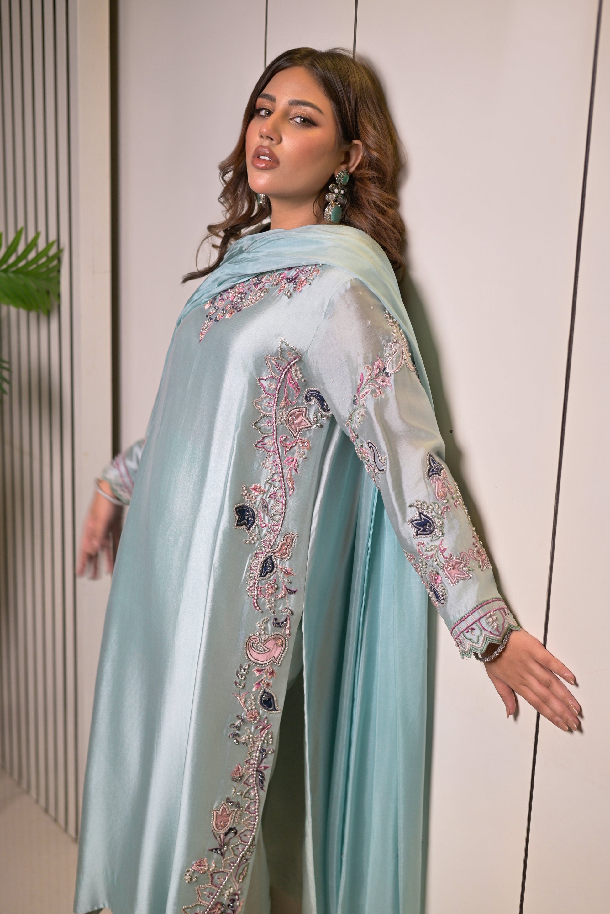 This refined 3-piece suit is rendered in luxurious sheesha silk in a soothing ice-blue shade, bringing a fresh yet regal charm. The long shirt is beautifully detailed with delicate embroidery along the neckline, sleeves, and side panels in soft pastel tones, giving it a graceful, feminine allure. Paired with matching straight pants and a flowing dupatta in the same serene hue, finished with subtle detailing, this ensemble exudes understated elegance. Perfect for daytime festivities and evening gatherings alike, it strikes the balance between soft sophistication and timeless luxury.