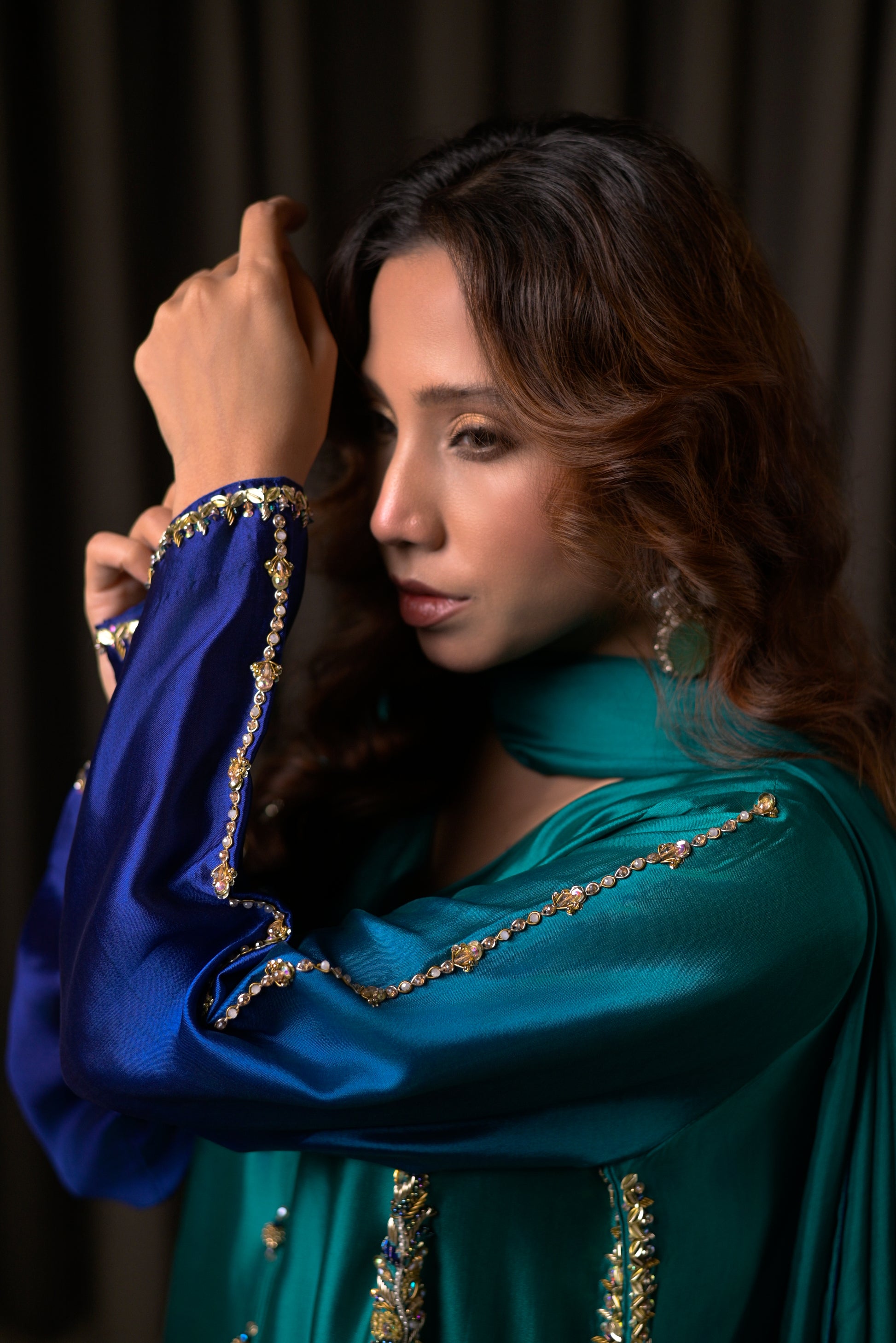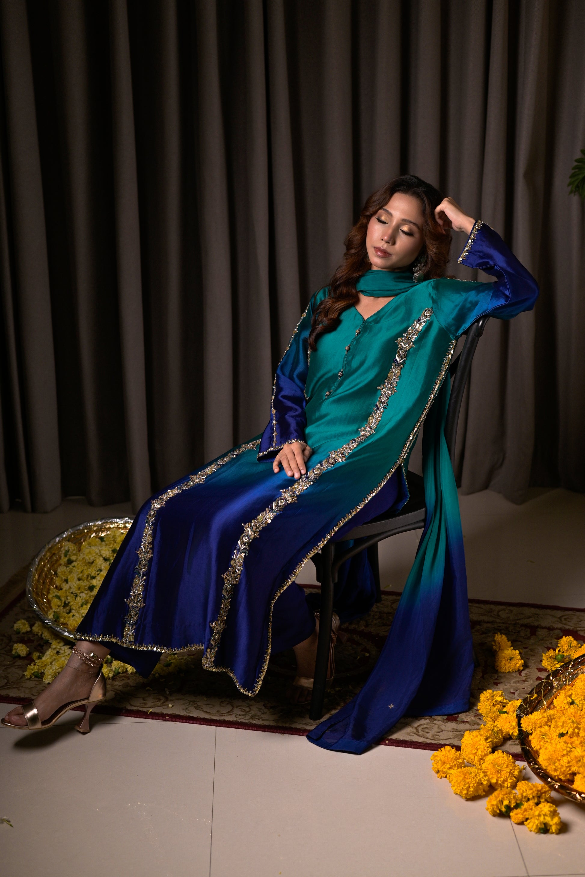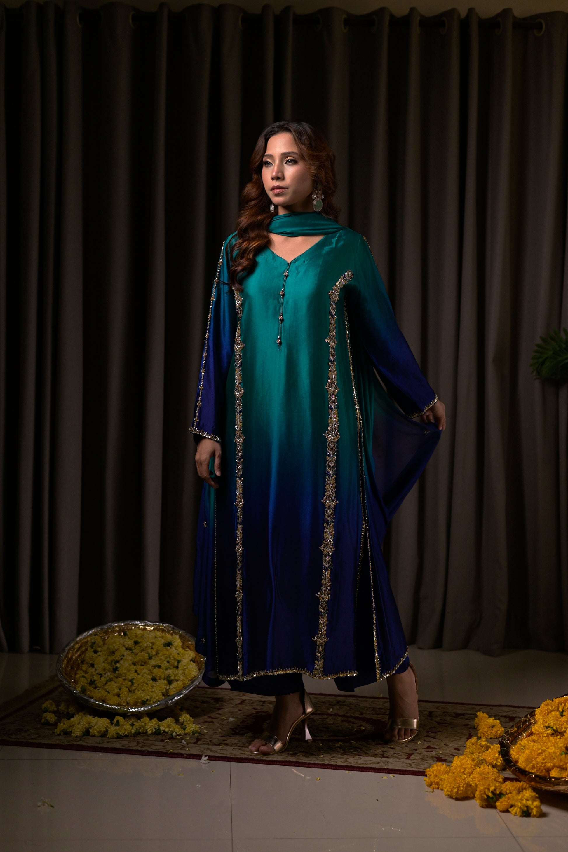 This stunning 3-piece suit is crafted in premium sheesha silk, featuring a mesmerizing ombré gradient in sea green and deep blue. The long flowing shirt is adorned with intricate handwork in gold along the neckline, sleeves, and front panels, adding a regal touch to the rich fabric. Paired with solid matching pants for a balanced silhouette, the outfit is completed with a two-tone ombré dupatta embellished with delicate gold handwork along the borders. Elegant and timeless, this ensemble is perfect for festive occasions, evening events, and celebrations where effortless grace meets luxury.