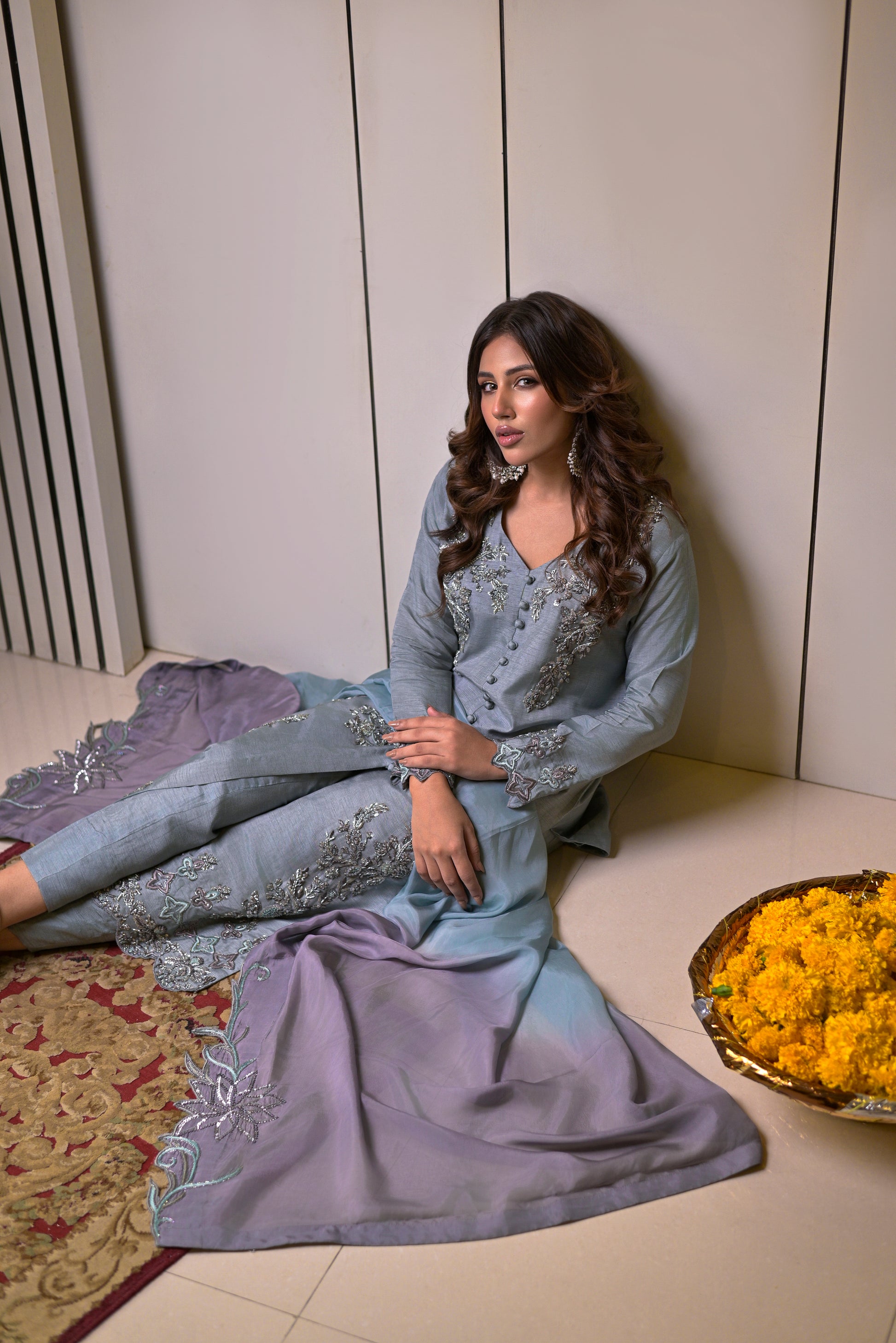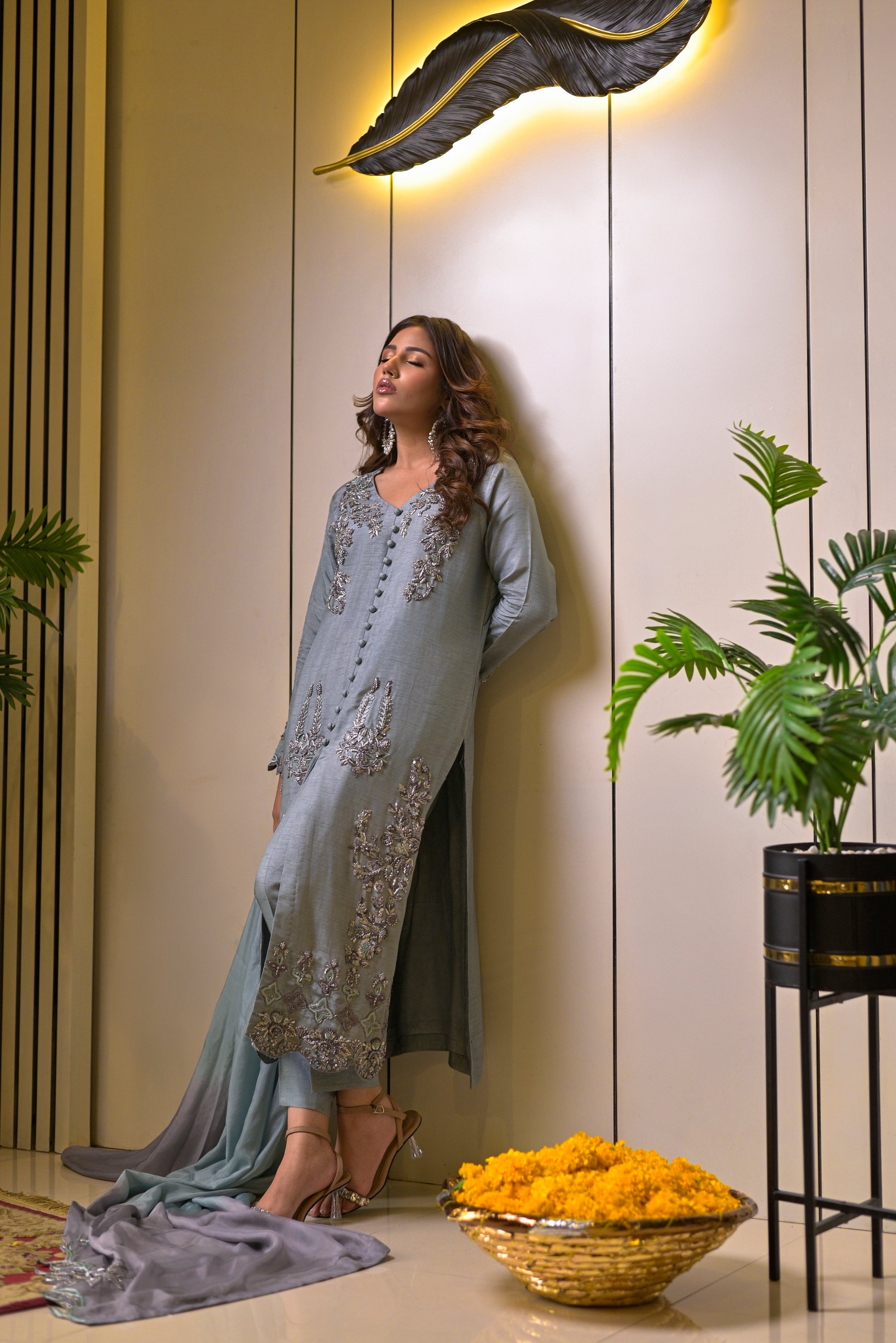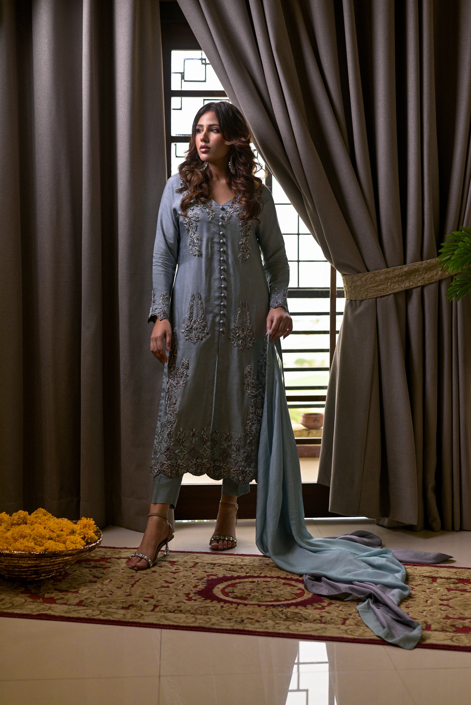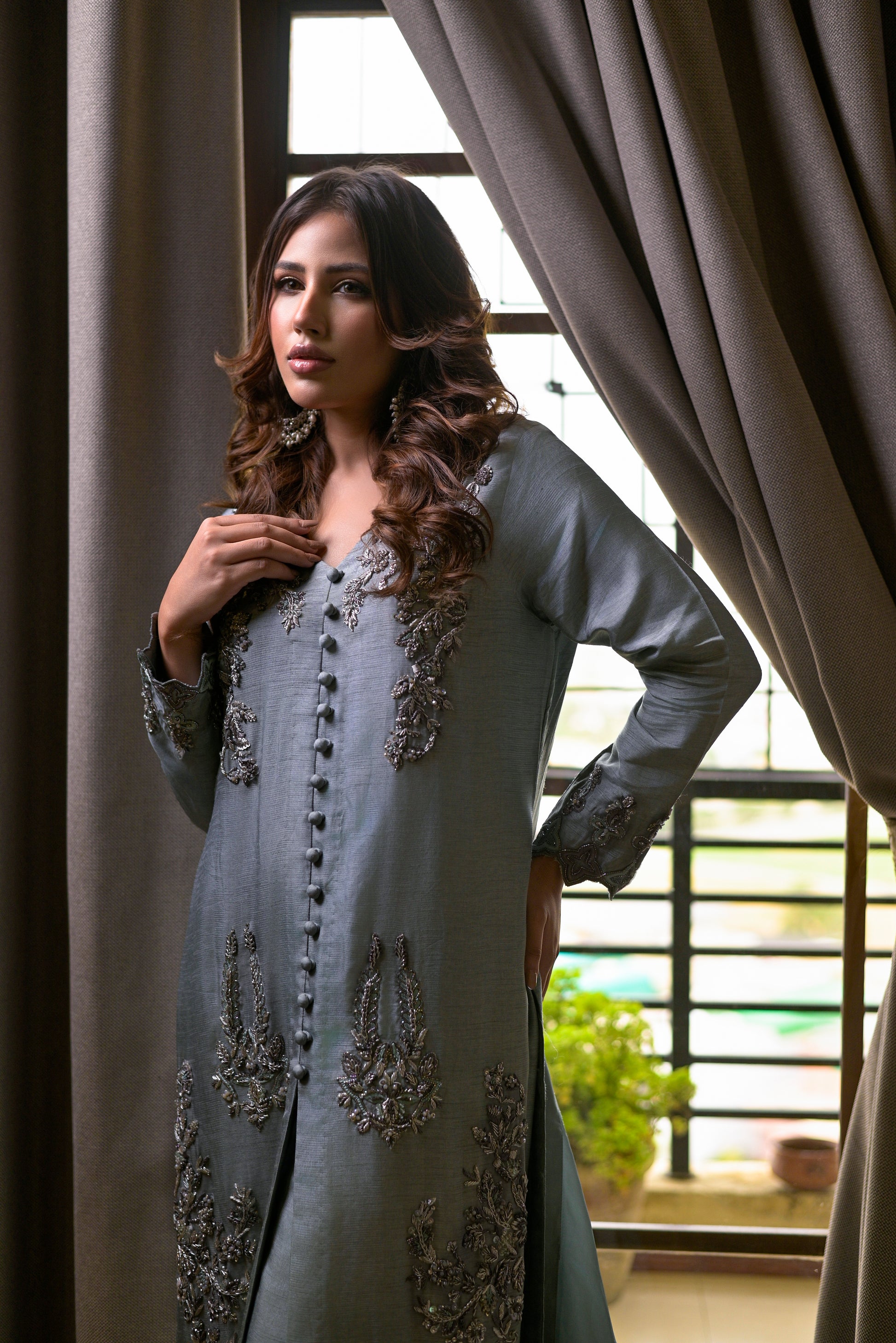 This stunning outfit is tailored from luxurious Korean raw silk, offering a rich texture and graceful fall. Designed in a cool slate-grey tone, the shirt features a straight-cut silhouette adorned with intricate embroidery in silver and grey threadwork along the neckline, sleeves, and hemline. Fabric-covered buttons cascade down the front, adding a refined, classic touch to the design. The scalloped border enhances its elegance, while the matching raw silk trousers keep the look cohesive. Paired with a soft, flowing dupatta in coordinating shades, this ensemble beautifully blends sophistication with timeless charm — a perfect choice for formal gatherings and festive evenings.
