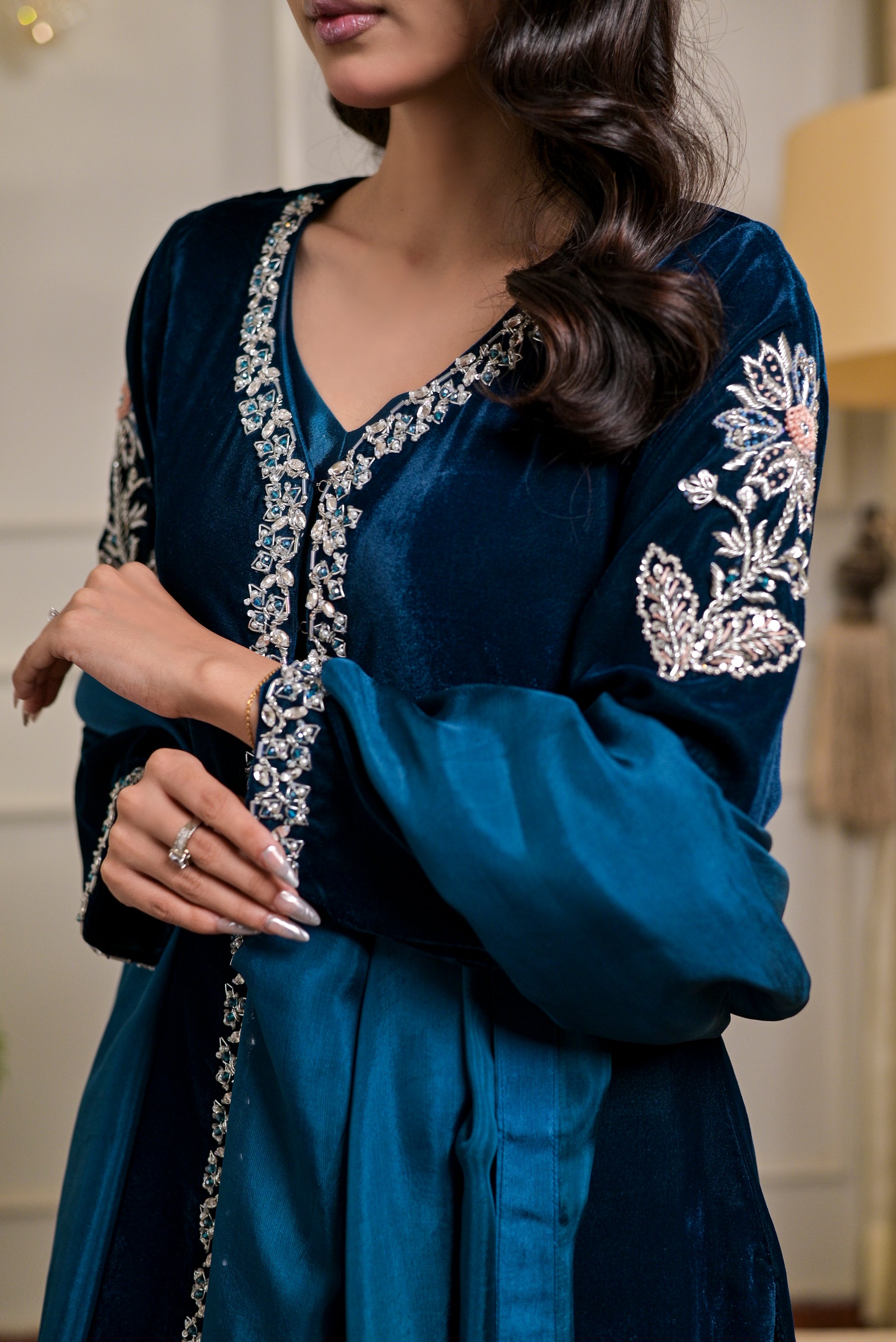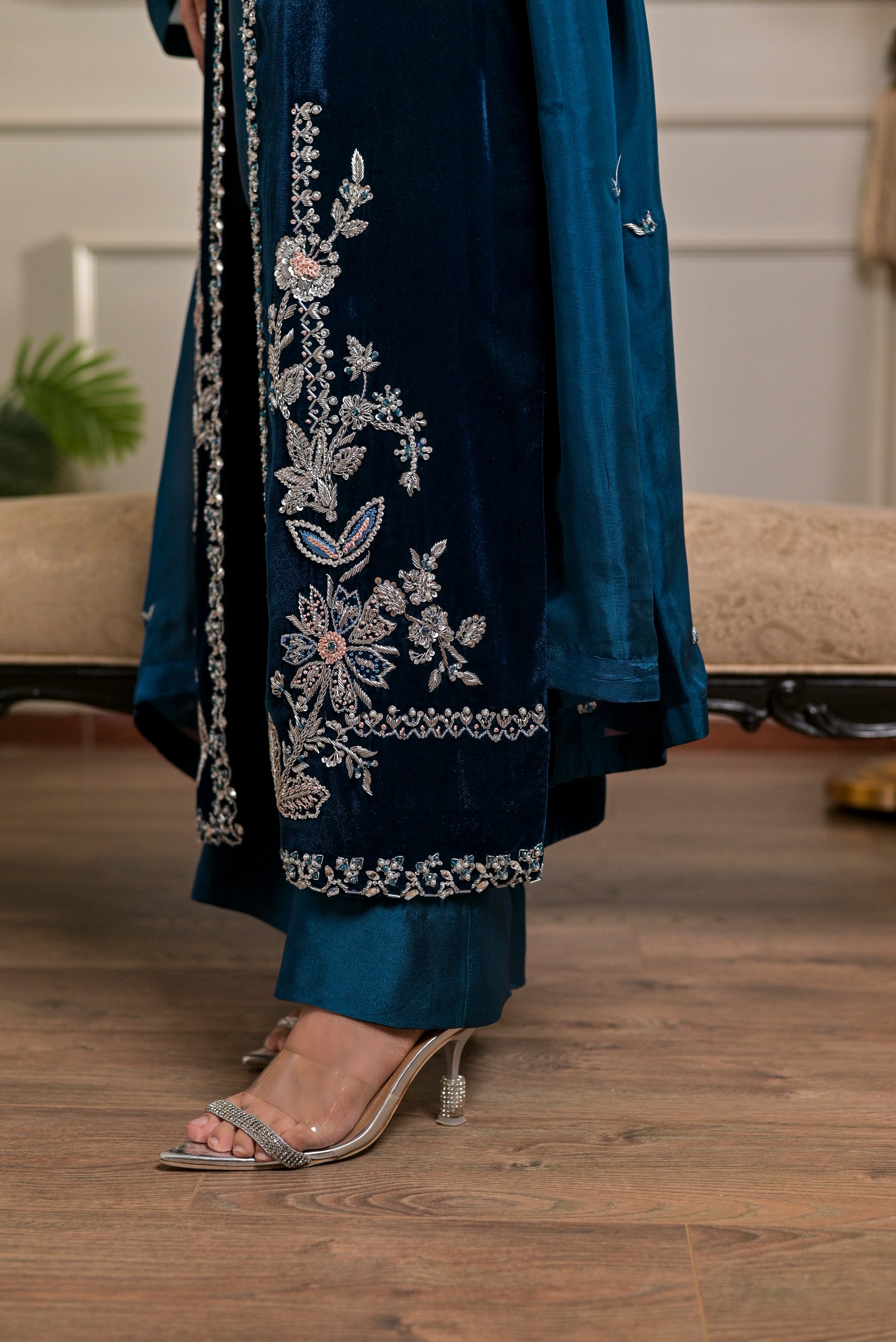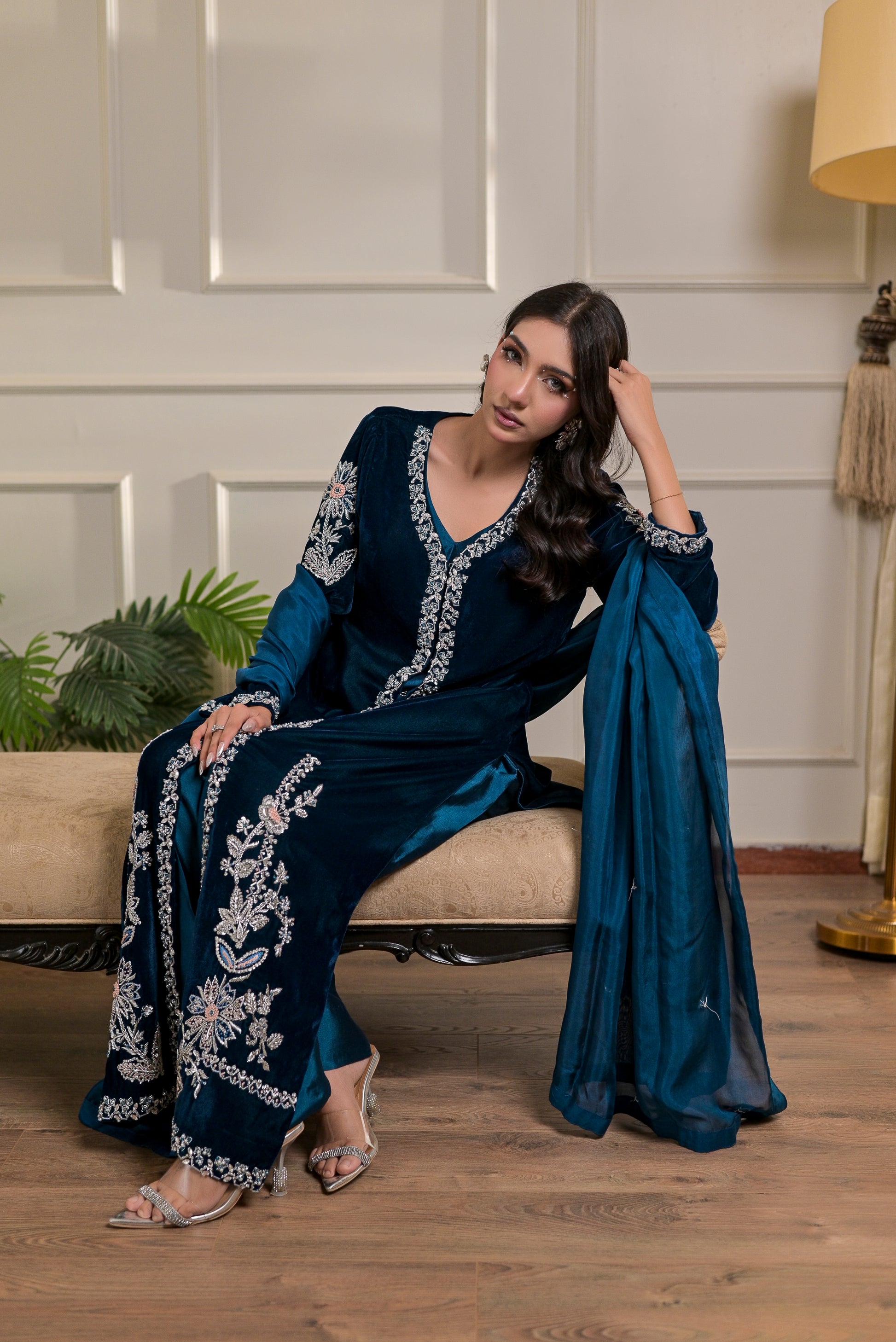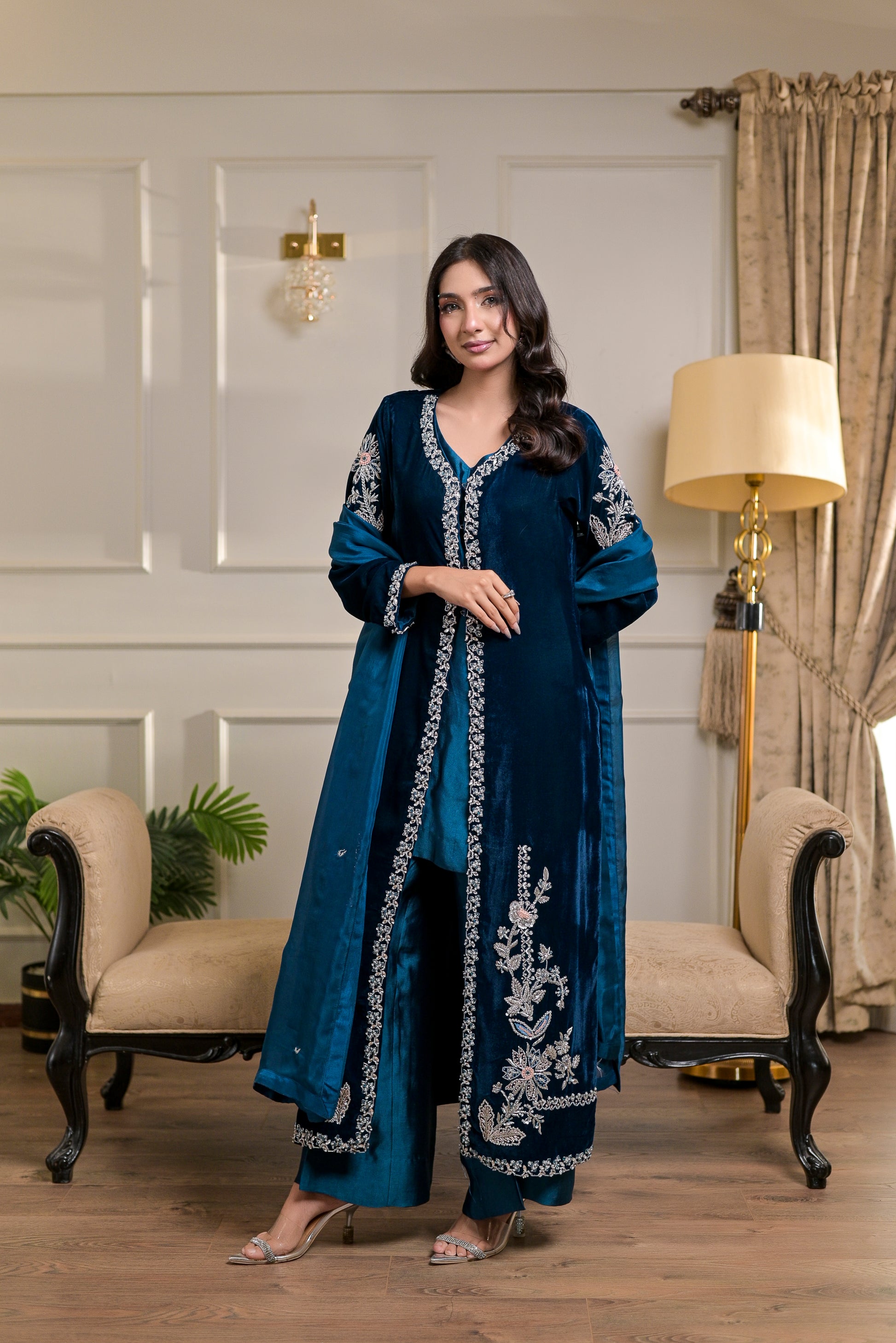 This deep teal velvet 3-piece by Nausheen Wamiq brings together timeless winter luxury and intricate craftsmanship. The long velvet shirt features detailed silver and pastel handwork along the neckline, front borders, sleeves, and hem, creating a beautifully elongated, regal silhouette. The embroidery flows seamlessly into the matching wide-leg trousers, adding balance and elegance. Paired with a soft, coordinated dupatta that carries subtle embellishment along the edges, this ensemble blends richness, comfort, and refined detailing—perfect for formal winter dinners, festive events, and evening occasions.