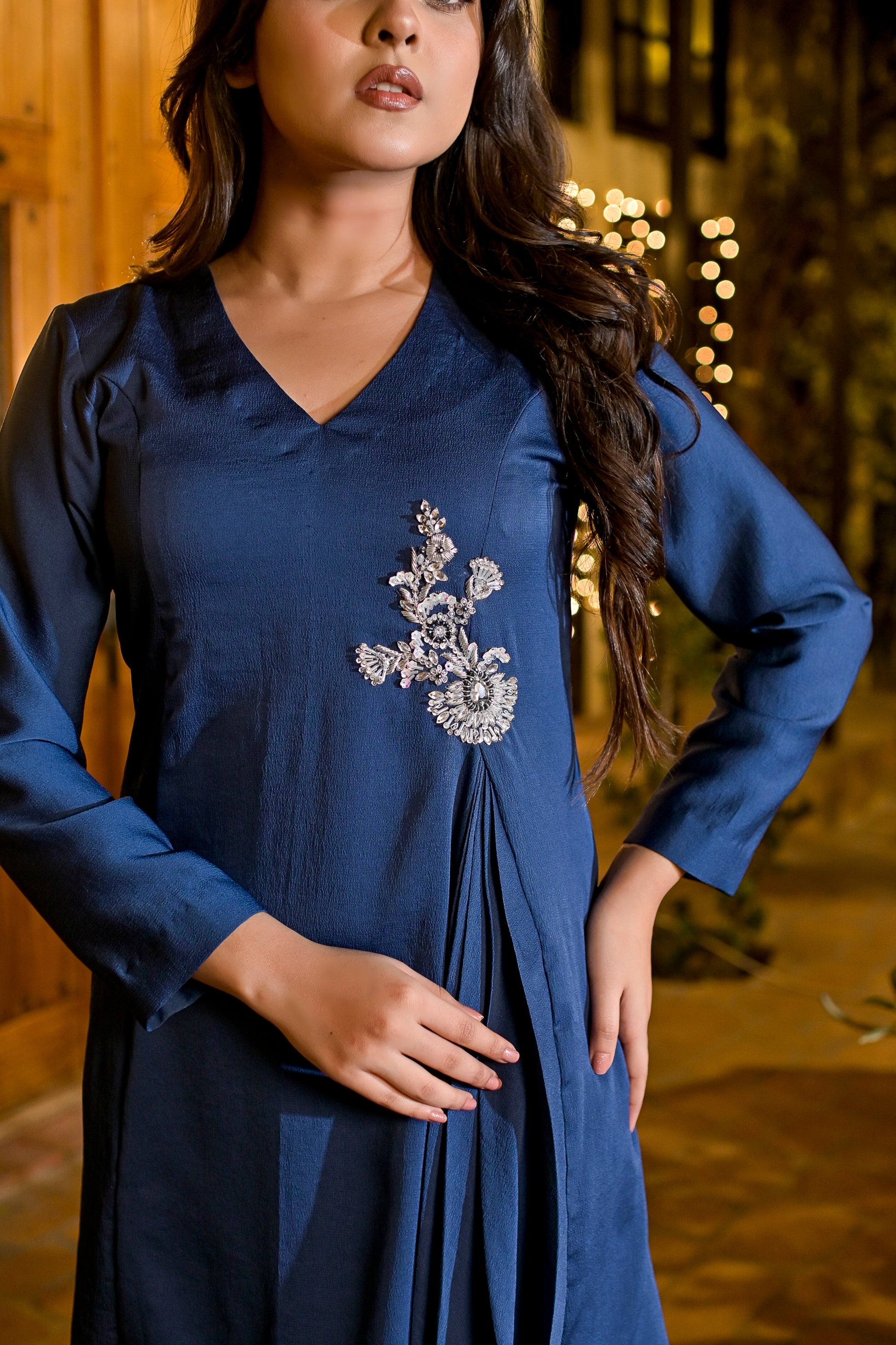 A dark blue co-ord set featuring a frock-style top with silver embroidery details and straight pants with side slits. The outfit combines elegance with modern flair, perfect for a semi-formal or evening look.