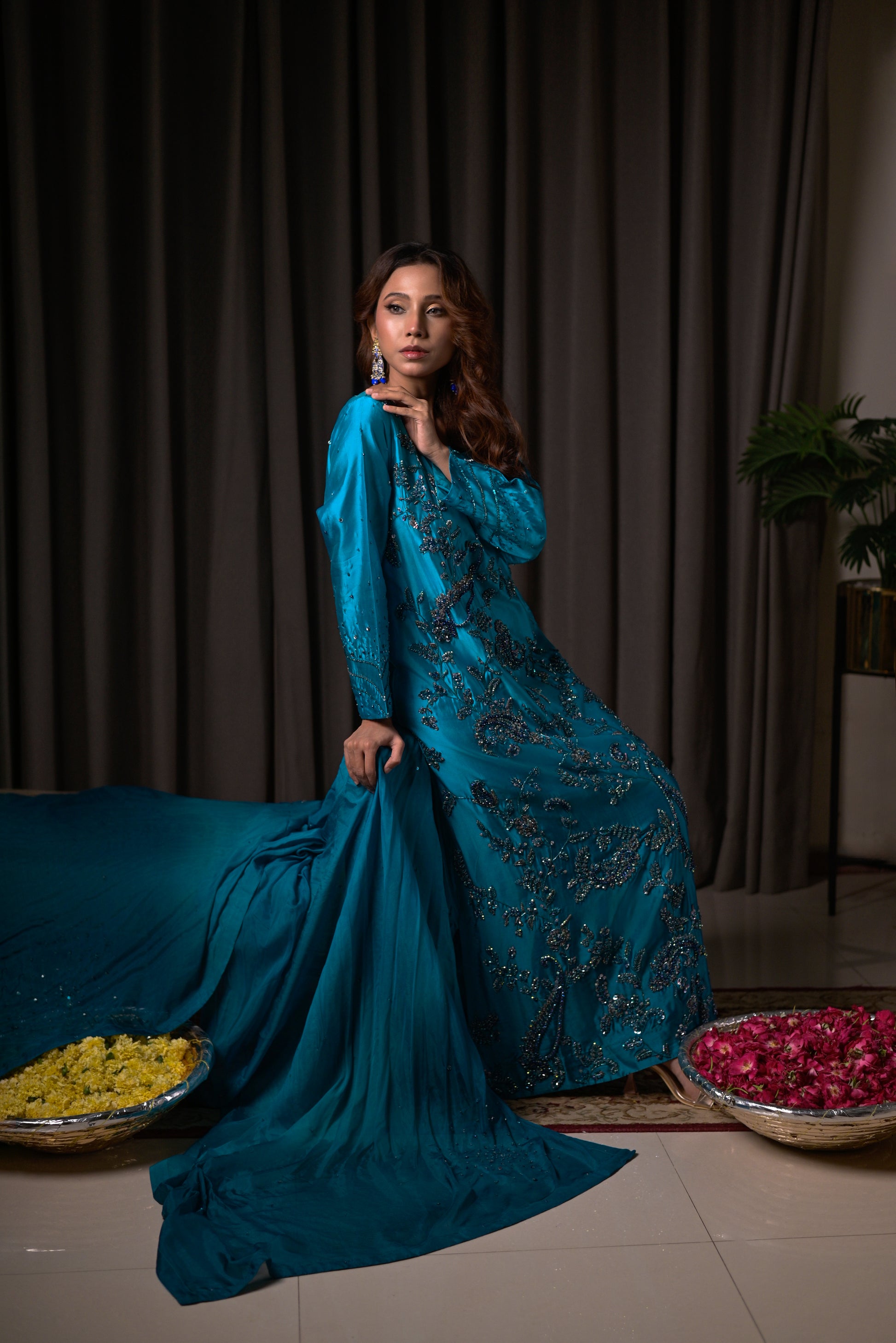 Draped in a bold and captivating turquoise hue, this silk ensemble radiates festive grandeur. The long flowy silhouette is richly adorned with intricate hand-embellished motifs in shimmering silver, featuring paisleys and delicate florals that cascade across the fabric. Full-length sleeves echo the same artistry, enhancing its regal appeal. The outfit is paired with a matching silk dupatta, completing the look with understated grace. Perfect for weddings, receptions, and celebratory evenings, this statement piece is where traditional craftsmanship meets modern sophistication, ensuring you stand out effortlessly.