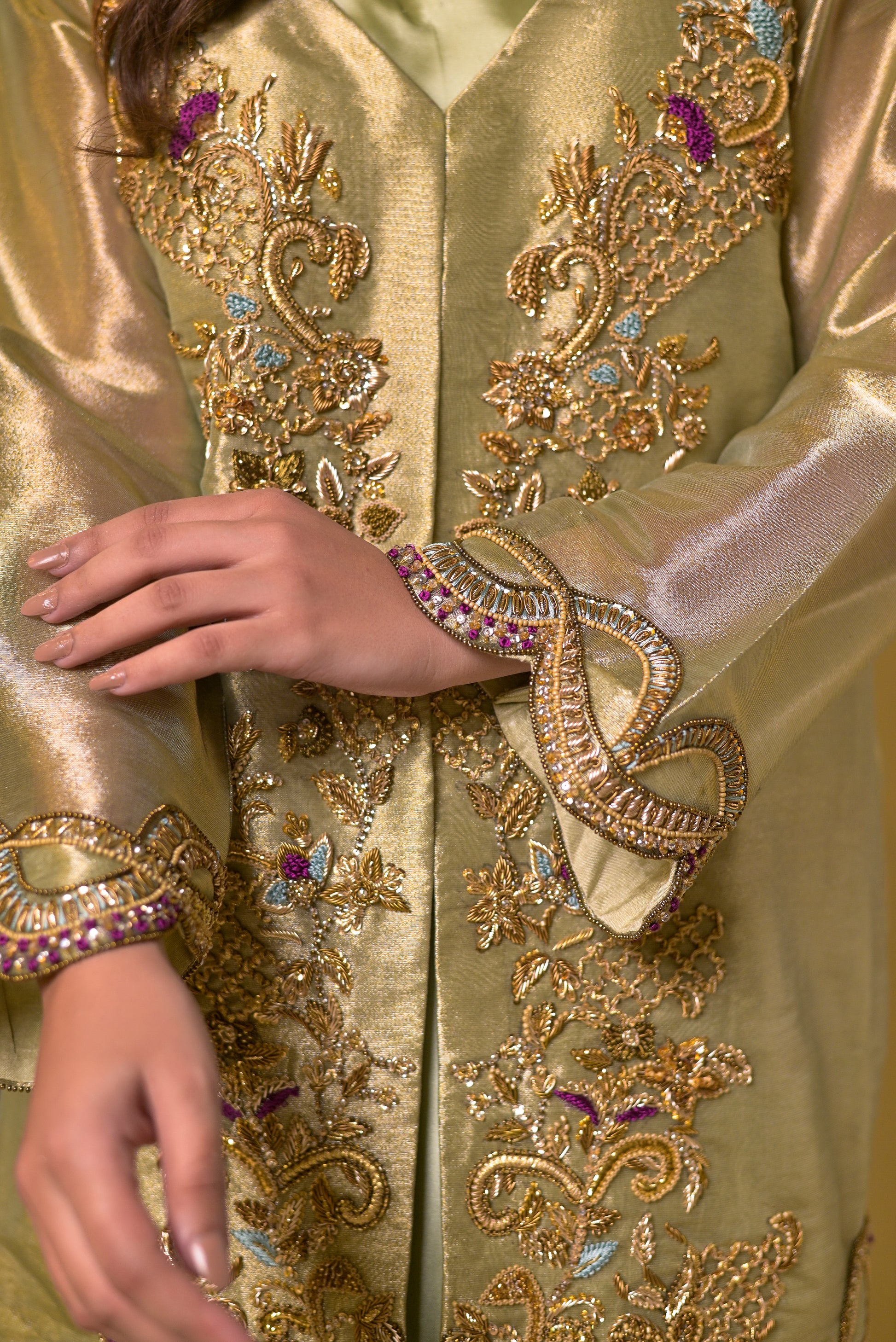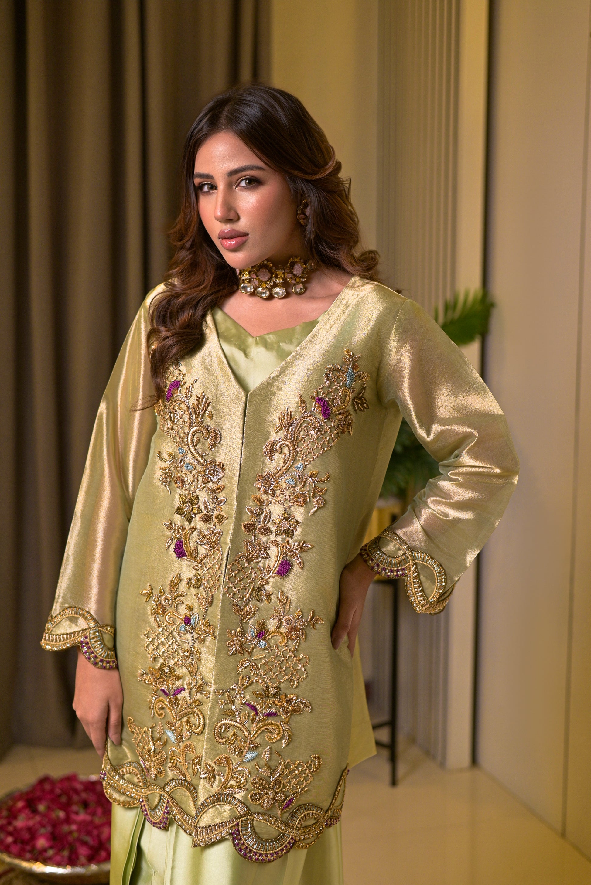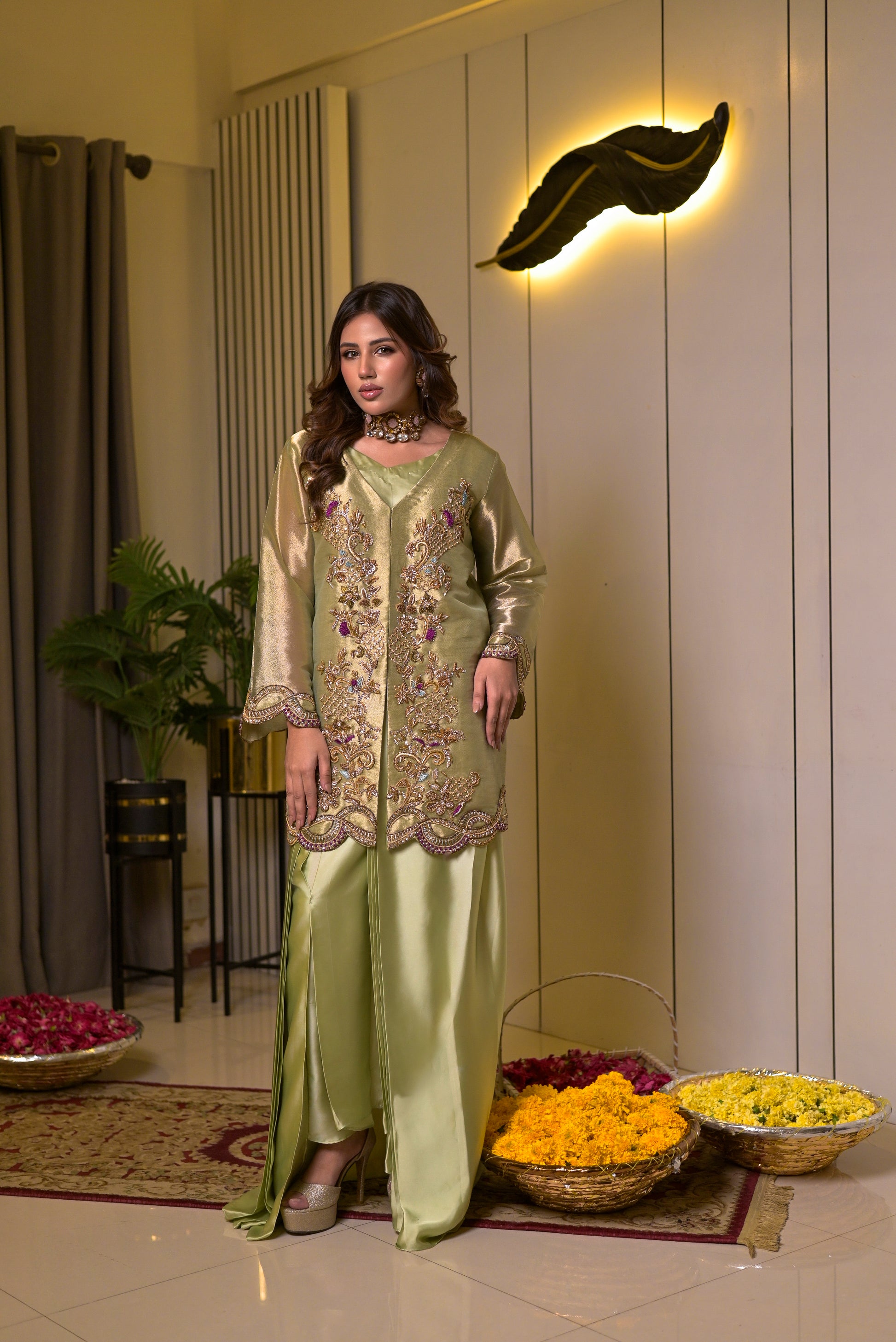 This luxurious outfit is crafted from premium sheesha silk in a soft pistachio green shade, giving it a rich and regal appeal. The front-open jacket design is heavily adorned with intricate hand embroidery in gold, maroon, and blue tones, creating a striking contrast against the silk base. The sleeves and hemline feature scalloped embroidered detailing, adding an extra layer of finesse. It is paired with a matching silk saree skirt in the same pistachio hue, which drapes beautifully and enhances the feminine silhouette. Perfect for weddings, festive soirées, or formal occasions, this look blends timeless craftsmanship with contemporary elegance.