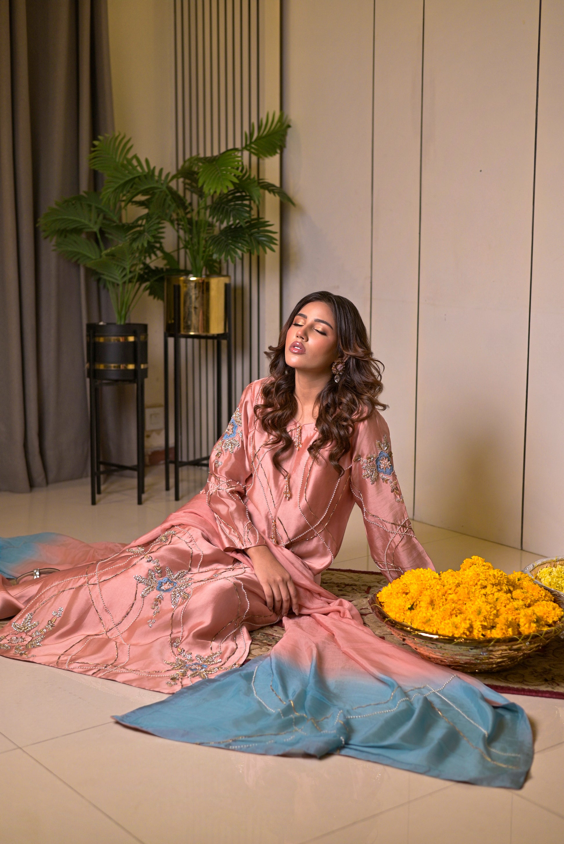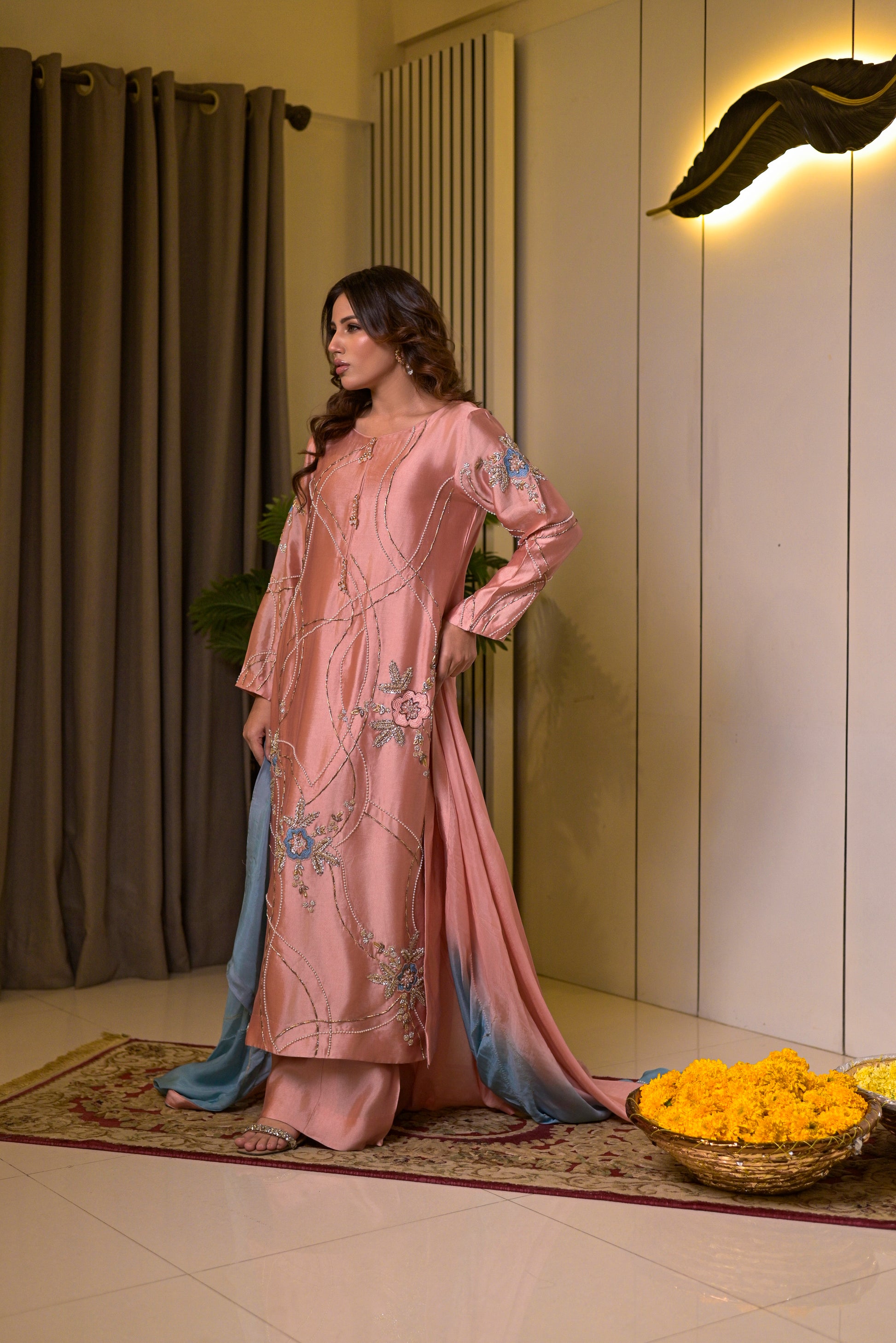 A vision of grace, this ensemble is tailored from premium blush-pink silk, exuding femininity and elegance. The long shirt is intricately embellished with delicate threadwork and shimmering bead embroidery, forming flowing patterns and floral accents in soft silver and blue hues. The wide-leg silk trousers enhance the fluid silhouette, adding effortless charm. Completing the look is an ombré silk dupatta, blending blush tones into a serene aqua blue, a refreshing contrast that elevates the entire outfit. Perfect for festive soirées and celebratory evenings, this design beautifully merges refined tradition with a modern, statement-making edge.