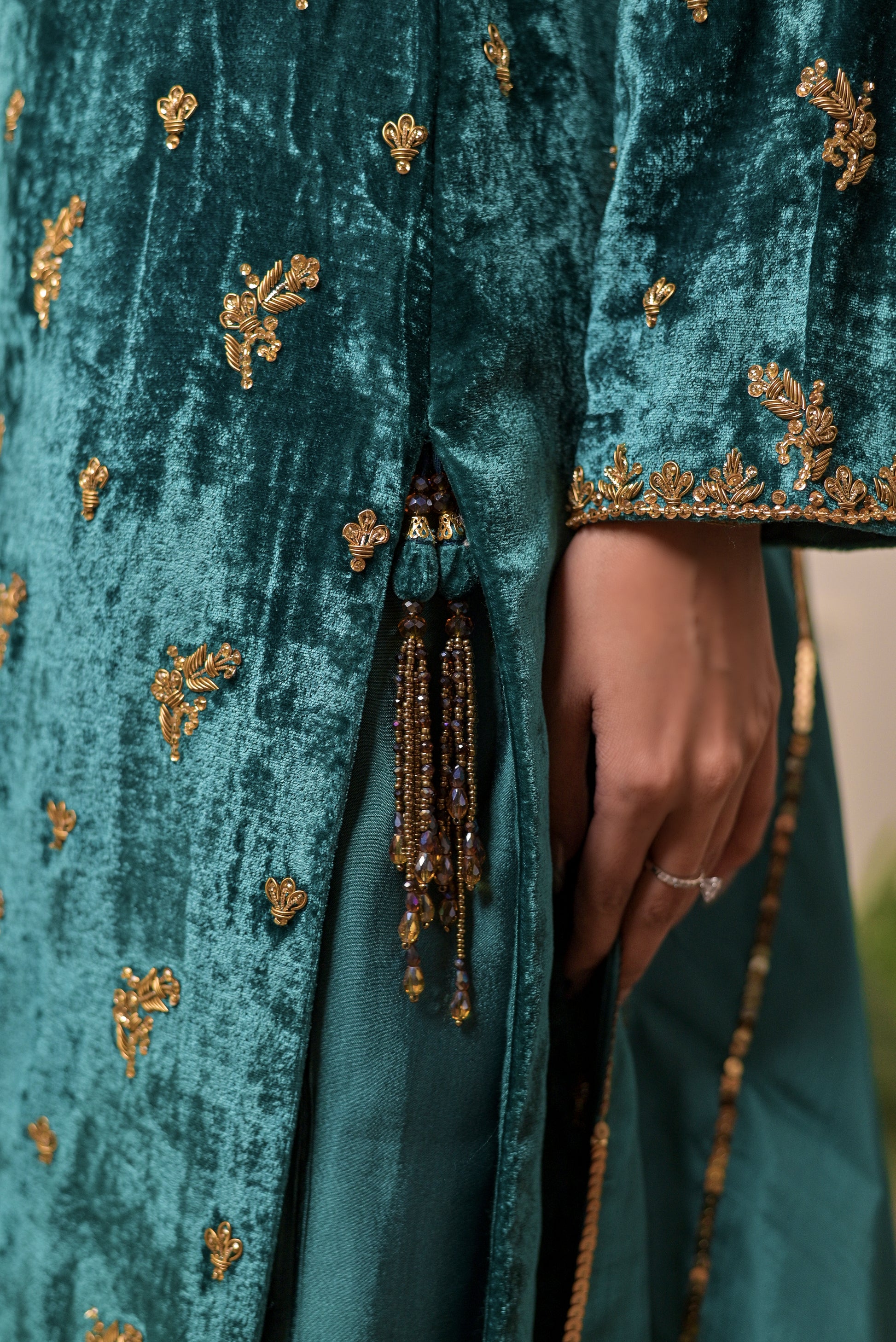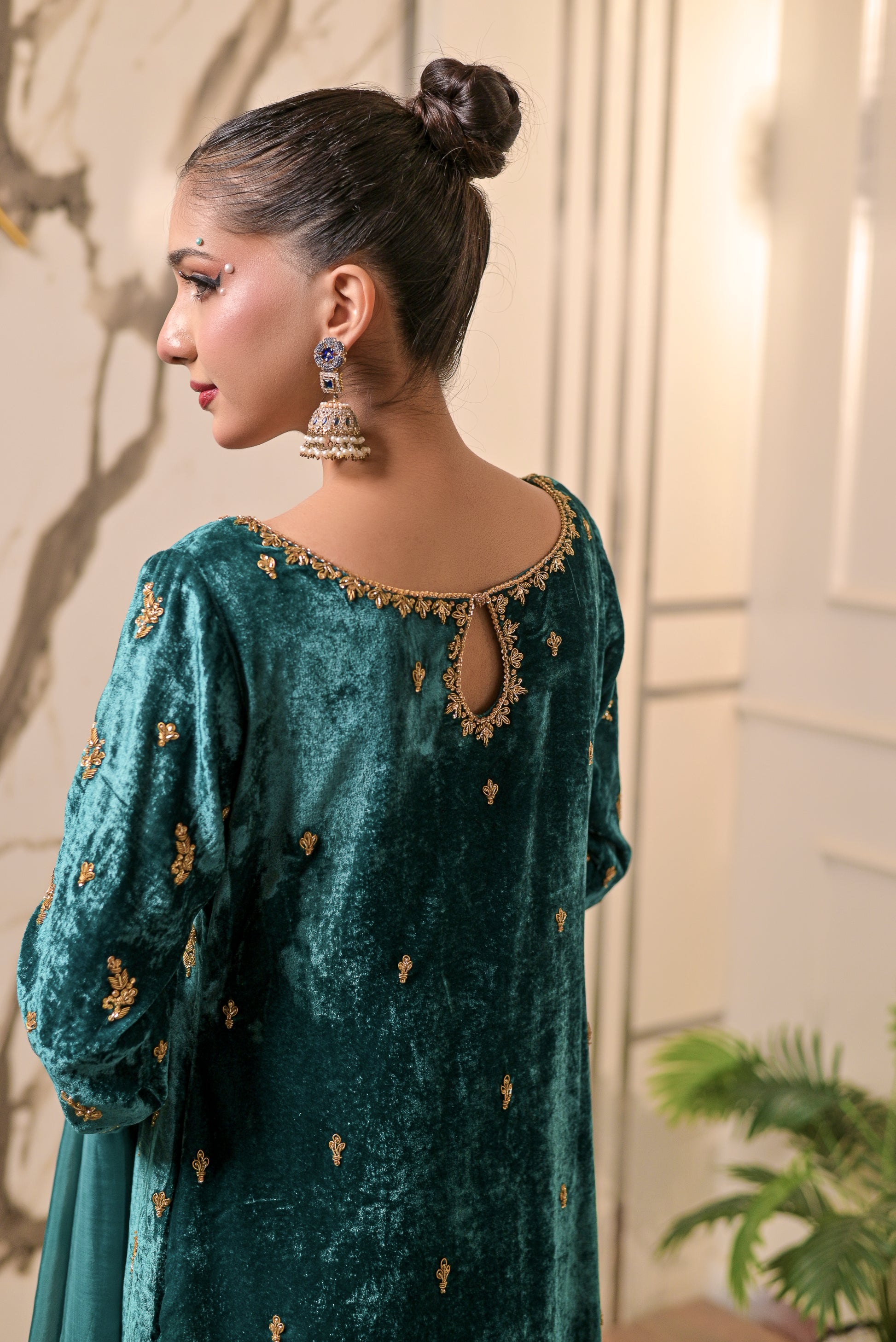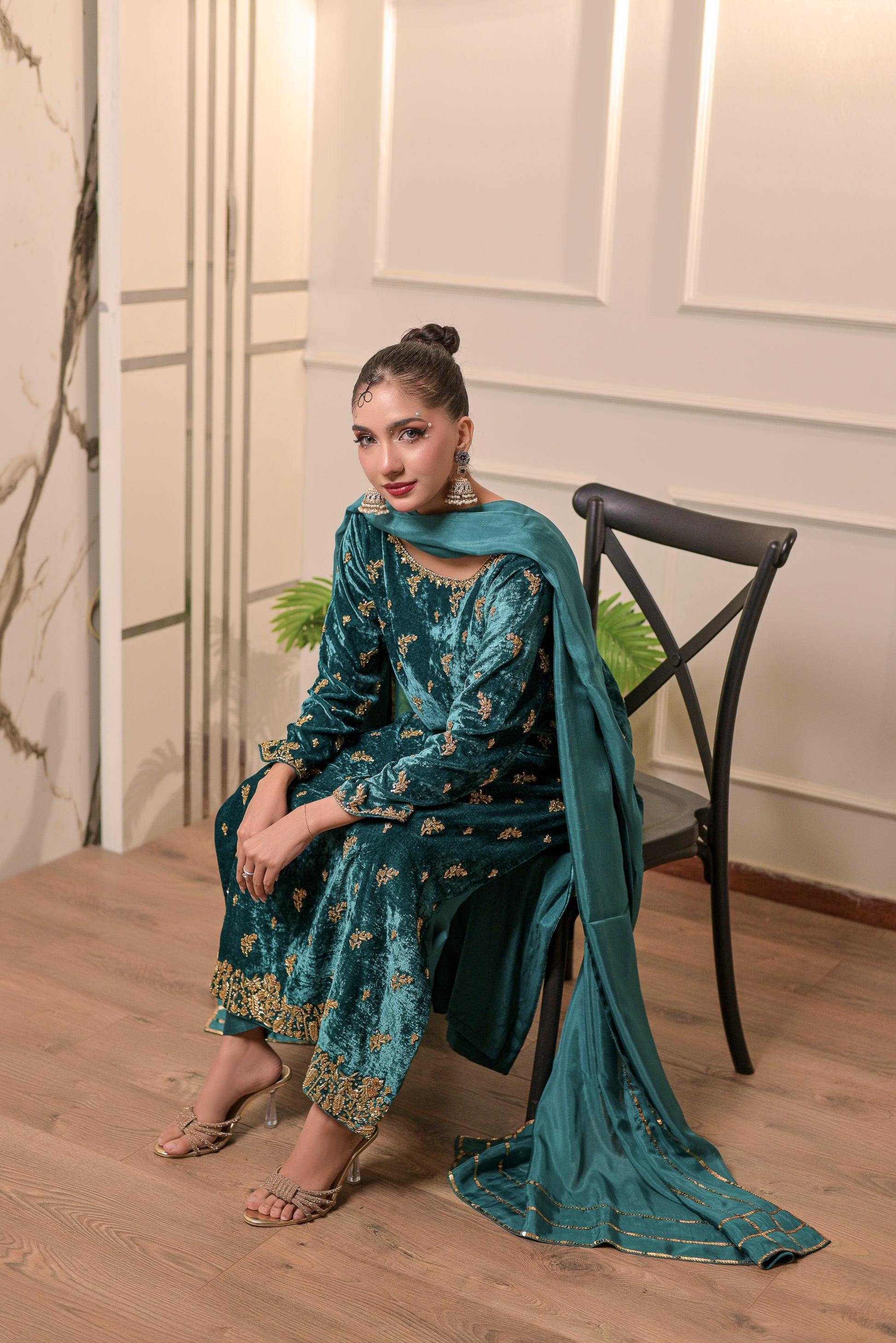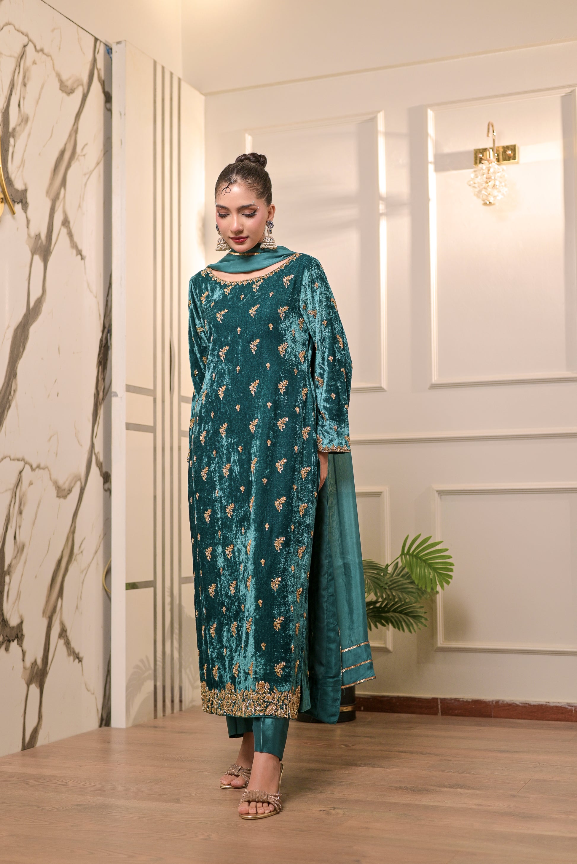 This deep teal 3-piece velvet ensemble by Nausheen Wamiq features all-over hand-embellished motifs crafted with dabka, marori, zari, and sequins, creating a rich yet refined winter look. The neckline and sleeves are delicately detailed to add subtle shimmer, while the shirt hem is finished with an ornate gilded border that elevates the entire silhouette. And handwork on the back. Paired with a sleek silk trouser and a soft matching dupatta with minimal accents, this outfit blends luxury, warmth, and timeless elegance—perfect for winter weddings, festive evenings, and formal gatherings.