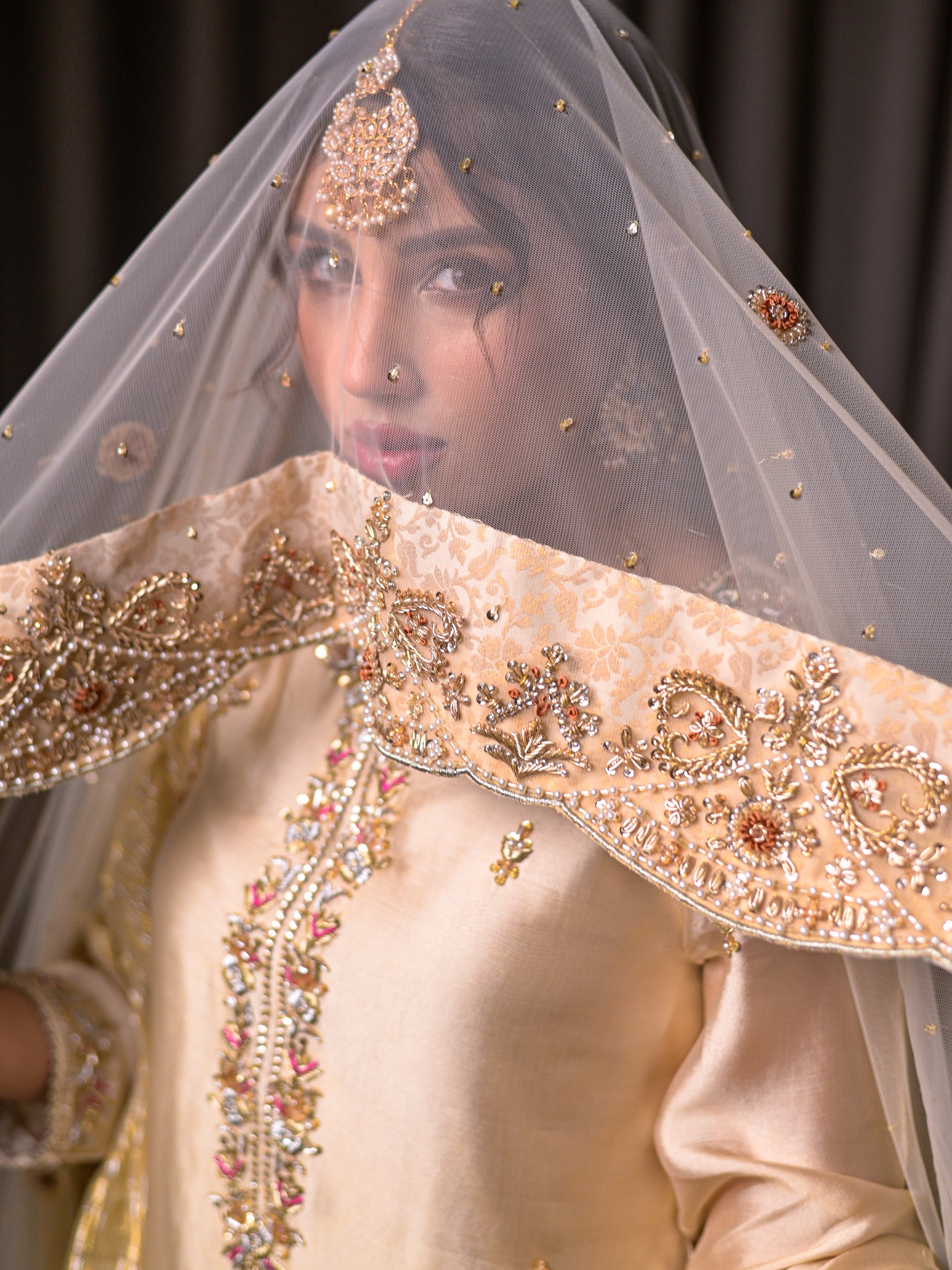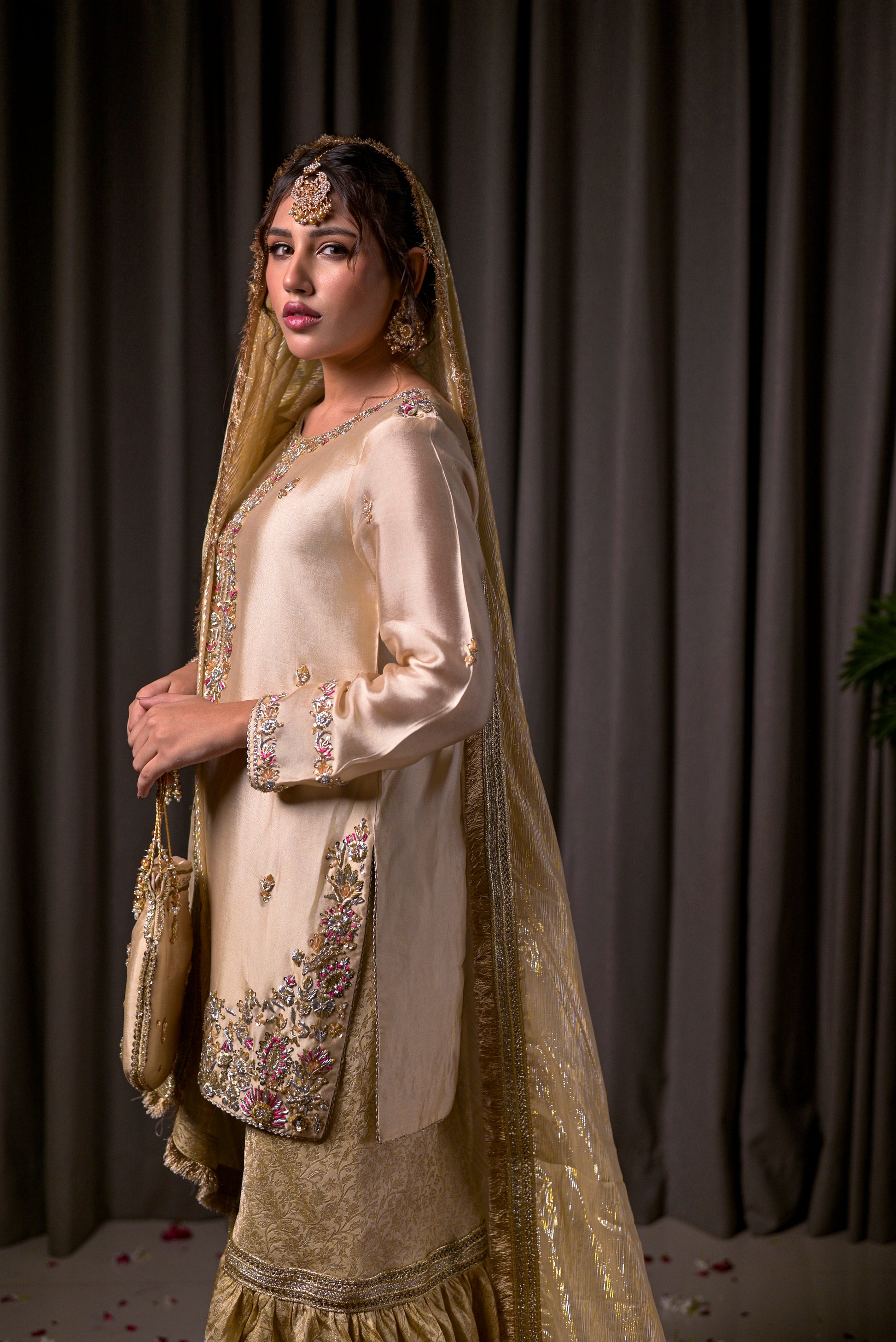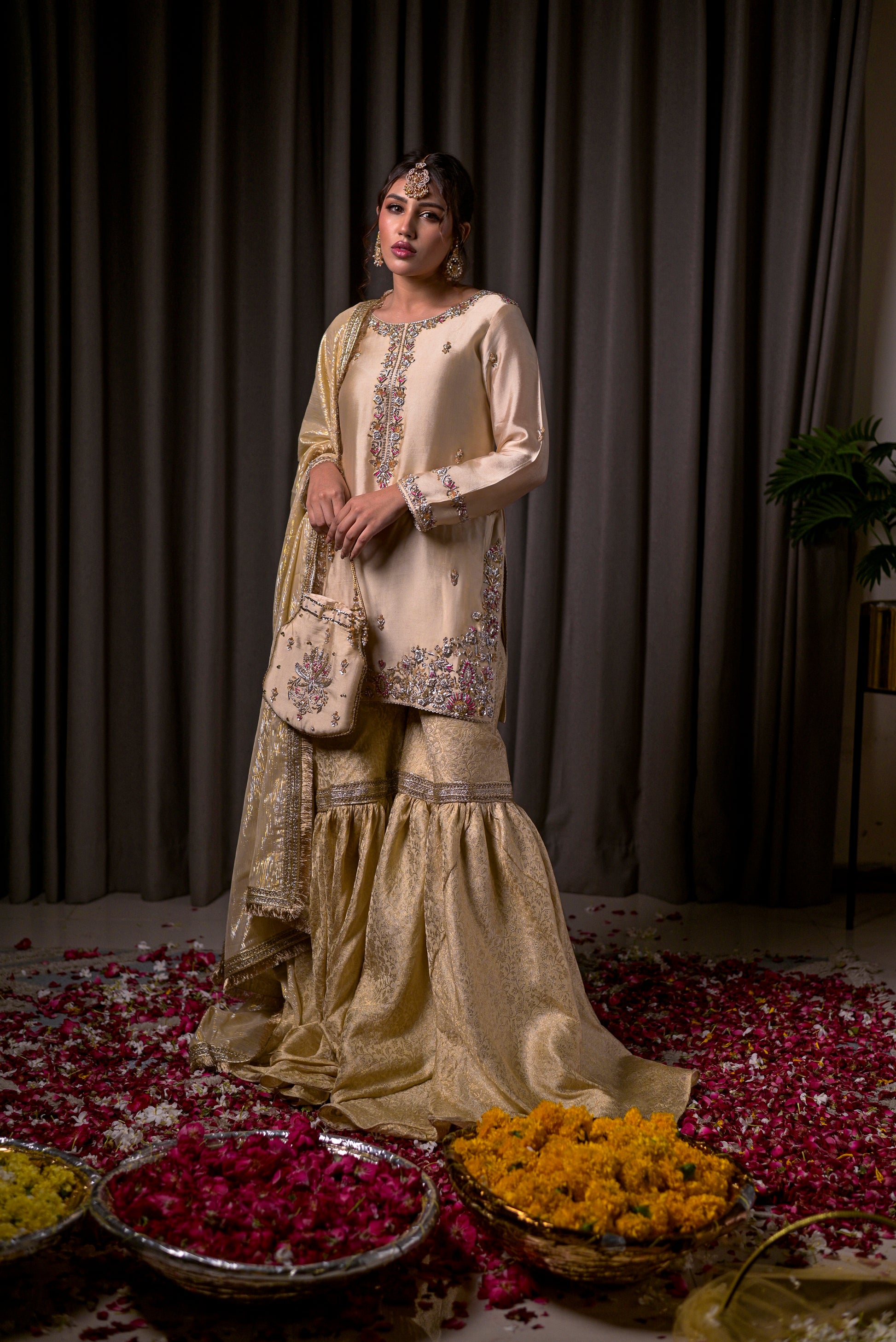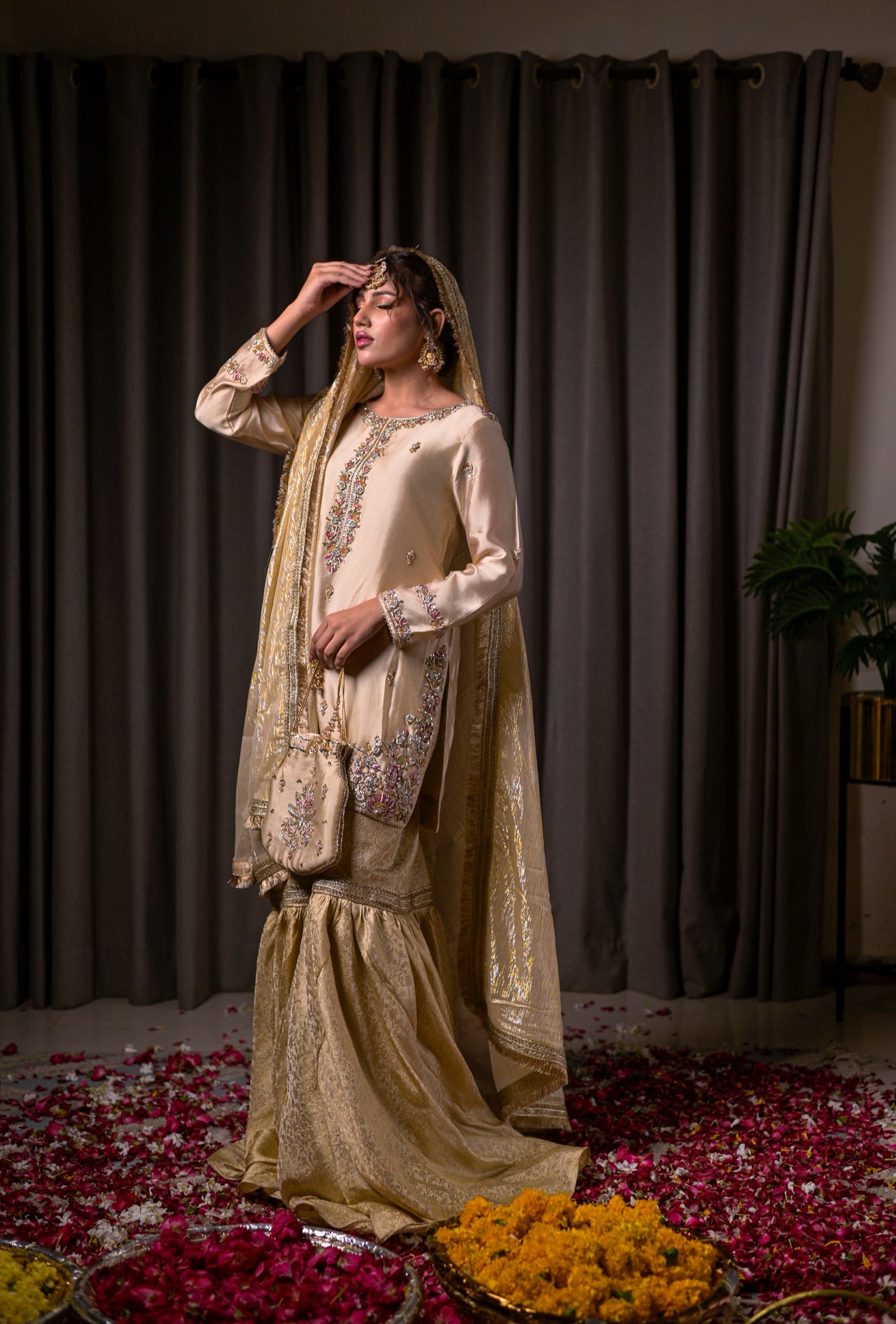 This elegant look features a shisha silk shirt adorned with intricate hand embroidery in soft pastel tones, paired with a gold banarsi gharara that adds a regal touch. The ensemble is completed with a mesuri dupatta beautifully detailed with gota and zari work, creating a perfect blend of tradition and sophistication. A timeless piece ideal for mehndi, nikkah, or festive occasions — exuding effortless grace and royal allure.