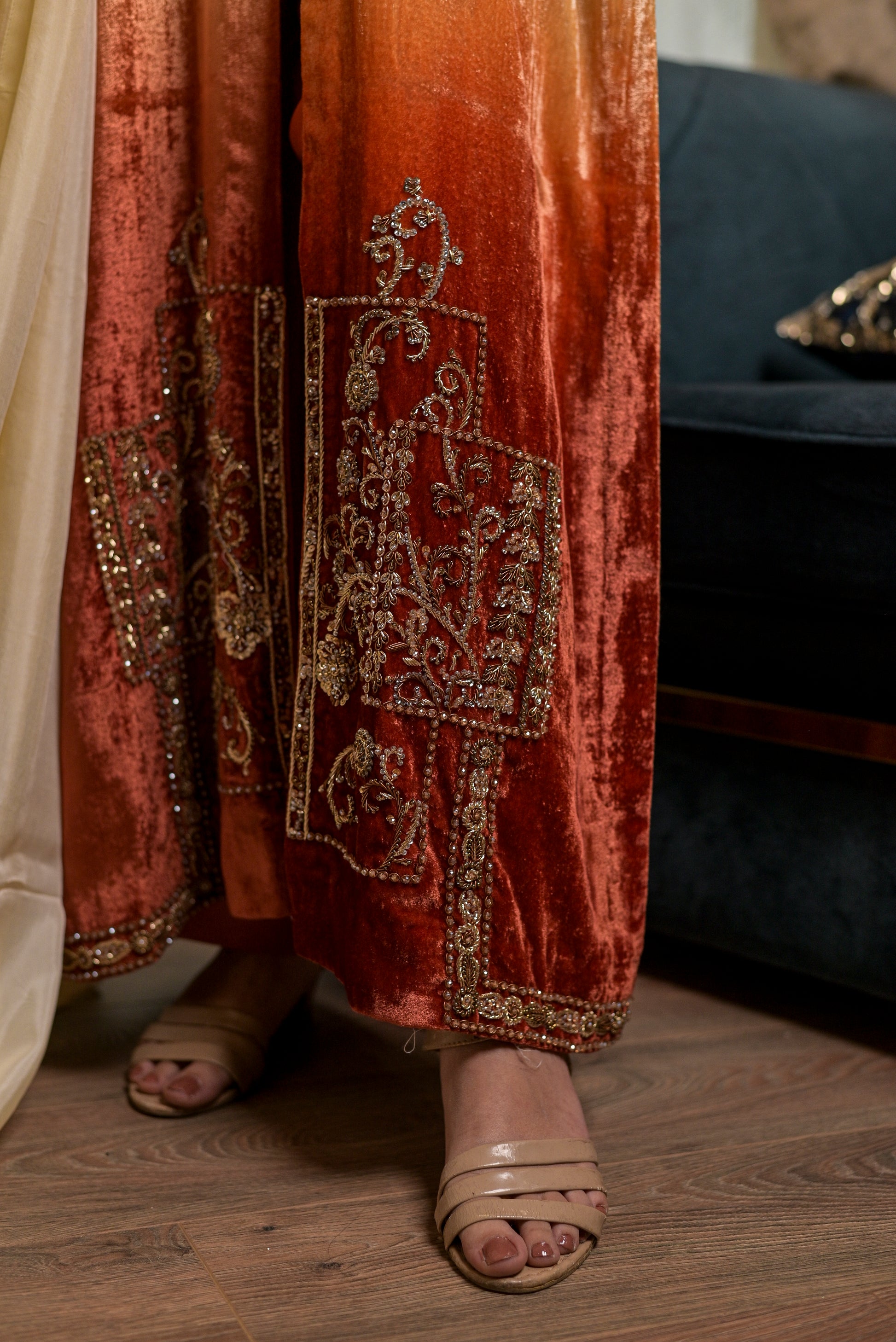 This stunning three-piece set by Nausheen Wamiq features a luxurious ombré velvet coat transitioning from soft beige to rich sunset orange, adorned with intricate embroidery along the neckline, sleeves, and hem. The inner shirt carries subtle matching embellishments for a beautifully cohesive look, while the flowing chiffon dupatta adds a touch of softness and grace. Perfect for winter dinners, festive evenings, and formal gatherings, this ensemble blends warmth, sophistication, and a striking color gradient that instantly elevates your presence.