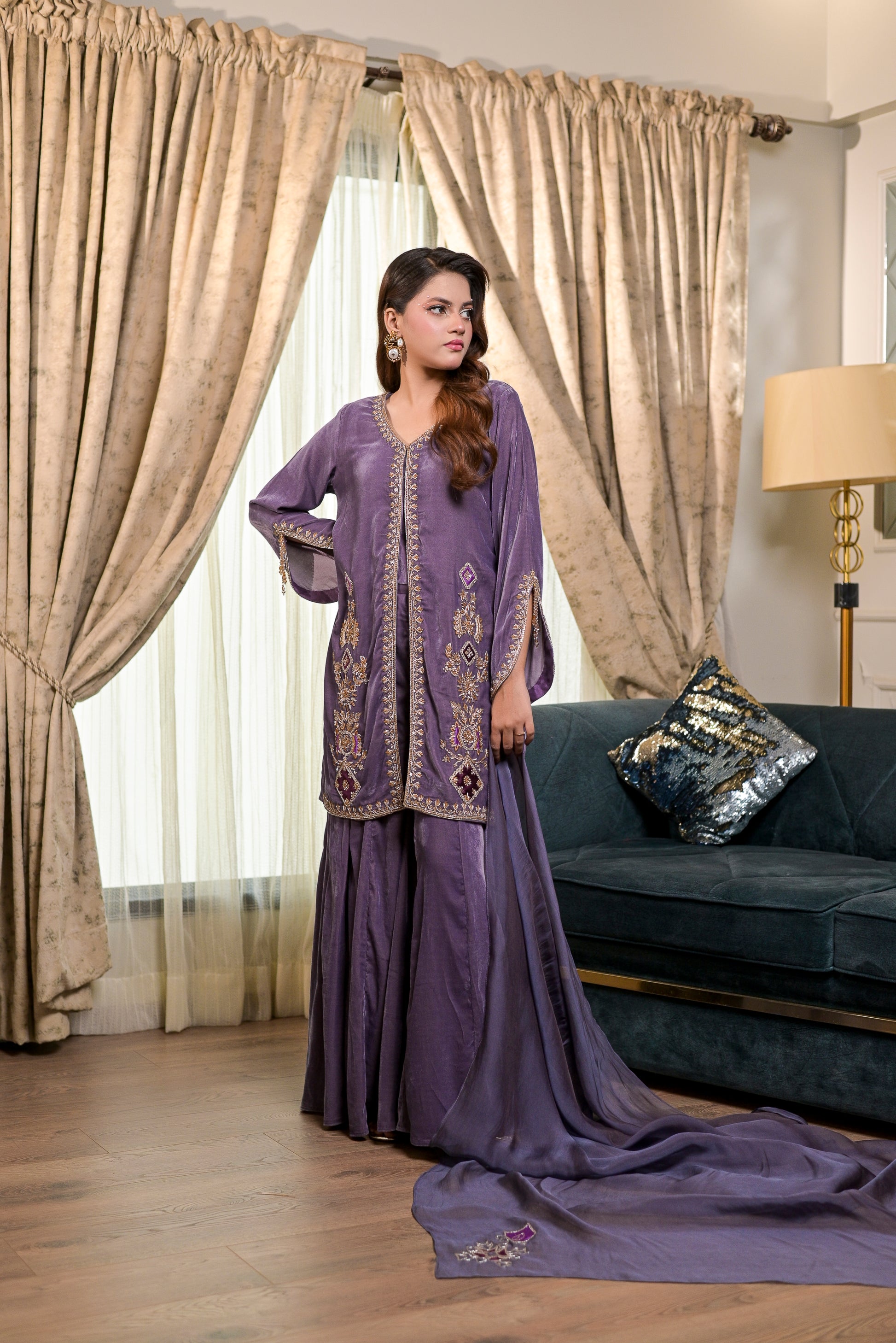 This lavender 3-piece velvet ensemble by Nausheen Wamiq features intricate marori, dabka, resham, and pearl handwork beautifully placed along the neckline, sleeves, and front panels, paired with a flowy gharara-style trouser finished with matching detailing. The lightweight dupatta carries soft embellishments that complete the look with grace. Elegant, feminine, and timeless—this set is perfect for winter festivities and evening occasions, offering a refined blend of luxury and craftsmanship.