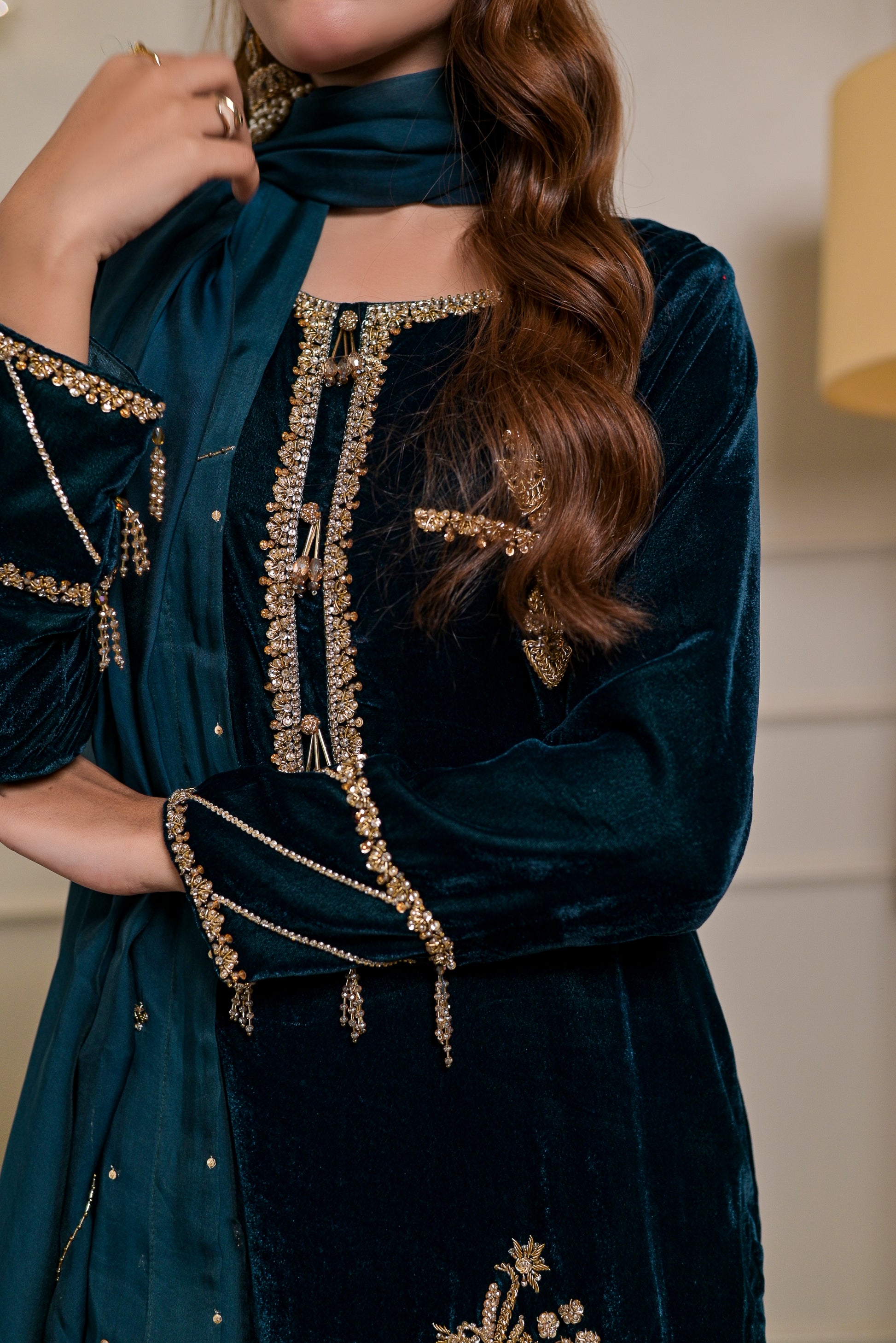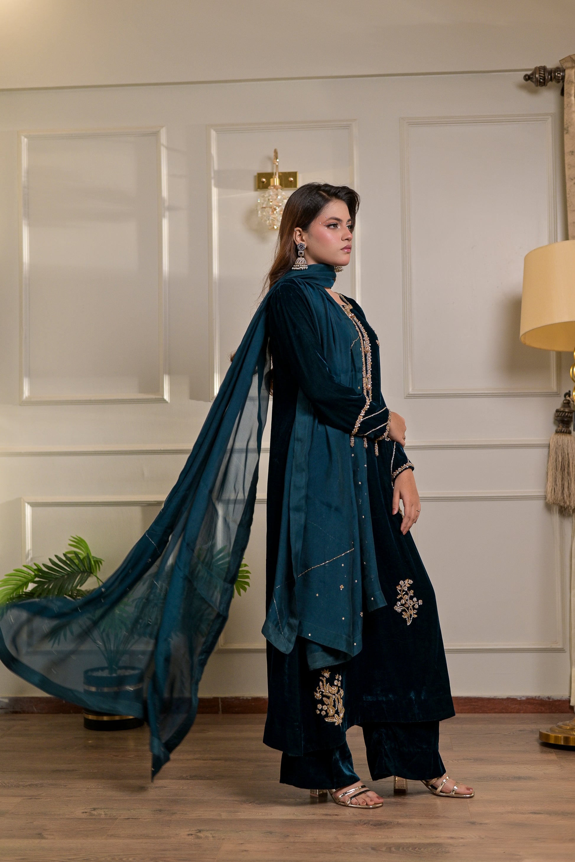 This deep teal velvet ensemble by Nausheen Wamiq embodies luxurious winter elegance. The rich jewel-toned velvet is enhanced with delicate gold handwork scattered across the front, sleeves, and borders, adding a refined touch of shimmer to the look. The outfit comes as a complete 3-piece set, paired with matching velvet trousers and a flowy chiffon dupatta that softly complements the outfit’s regal tone. Perfect for winter festivities and evening occasions, this design blends sophistication, warmth, and timeless charm.